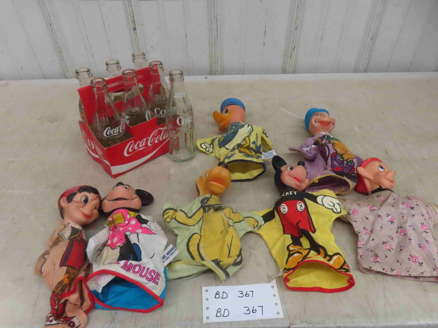 (7) 1950s Walt Disney Hand Puppets Mickey + Minnie Mouse, Pluto, Donald Duck, Pinocchio, Jiminy Cricket, Dopey - All in Good Condition & 7 Vintage Coca-Cola Bottles with Cardboard Holder