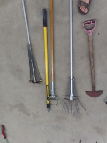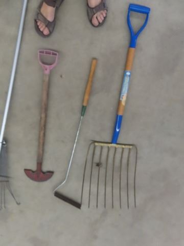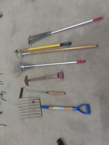 7 Hand Yard Tools; Forks, Extension Pole, Rakes, Edger, Grasswhip
