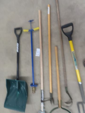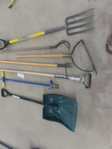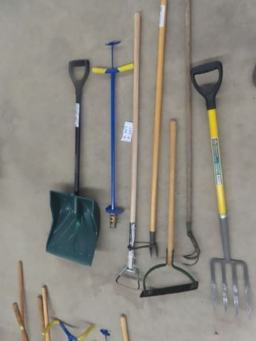 7 Hand Yard Tools; Shovel, Edger, Potato Fork, Grass whip, Sickle, Weed Puller