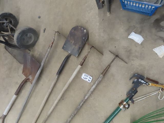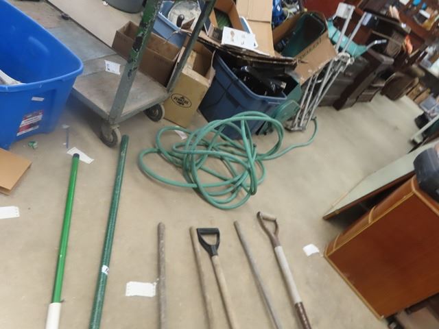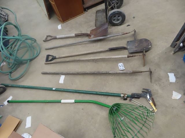 7 Hand Yard Tools ; Shovel, Spade, Hoe, Tree Branch, Rake, Hose