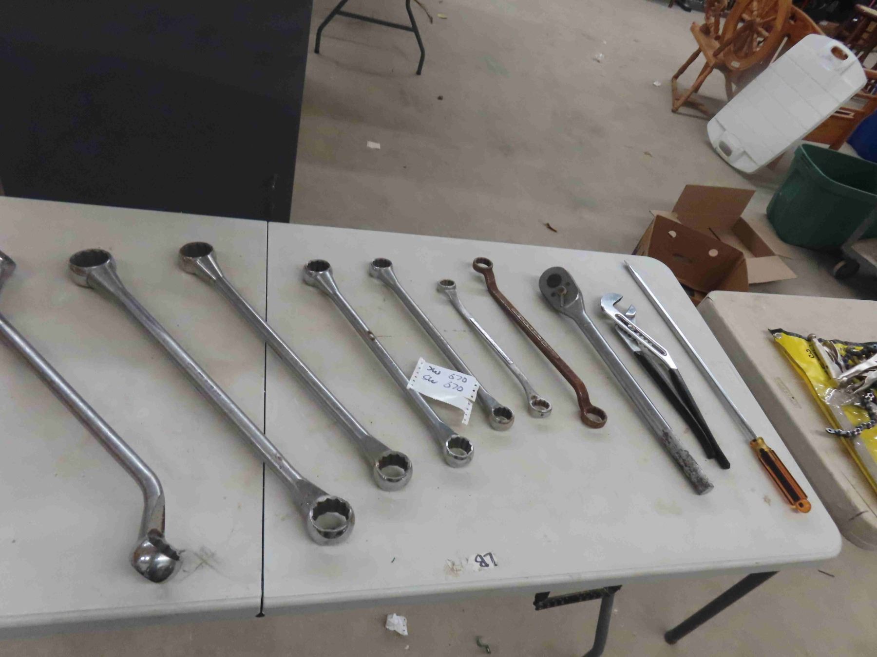 7 Large Wrenches up to 1 13/16", 3/4" Grey Ratchet, Large Channel Pliers, Flat Large Screwdrivers