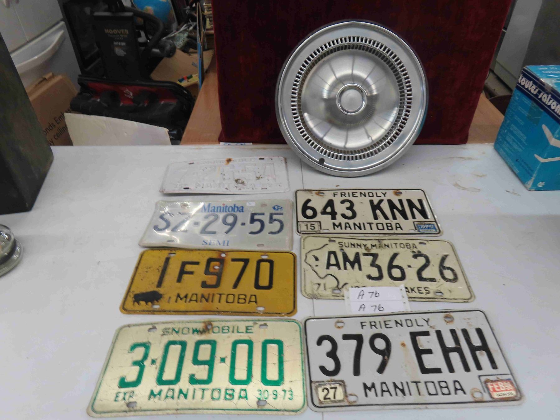 7 Manitoba License Plates Including 2 Snowmobile Plates , Hubcap