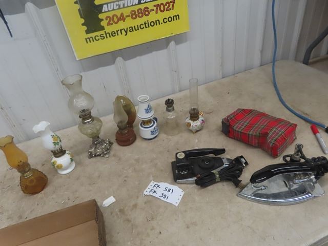 7 Miniature Coal Oil Lamps & 2 Electric Irons