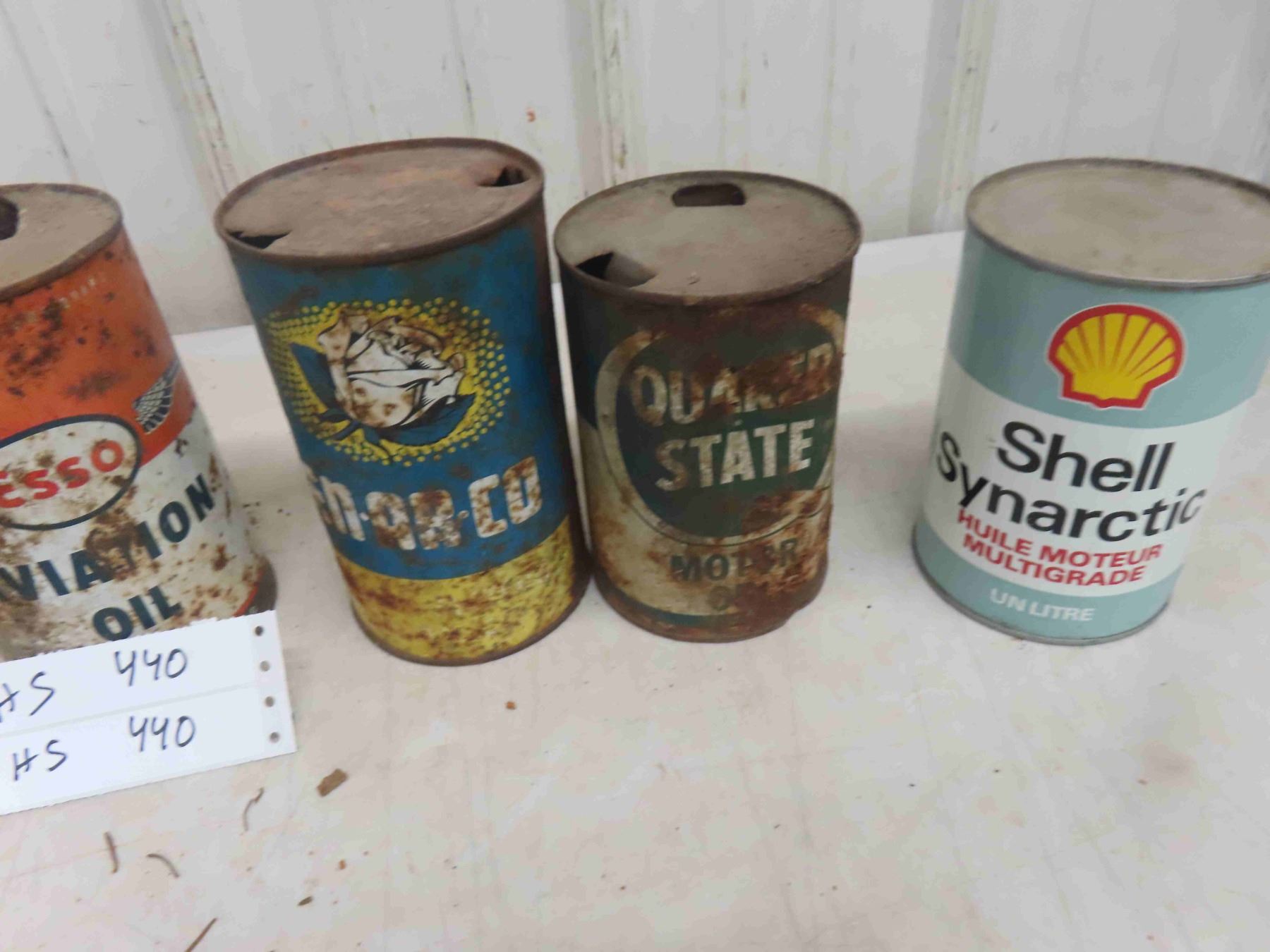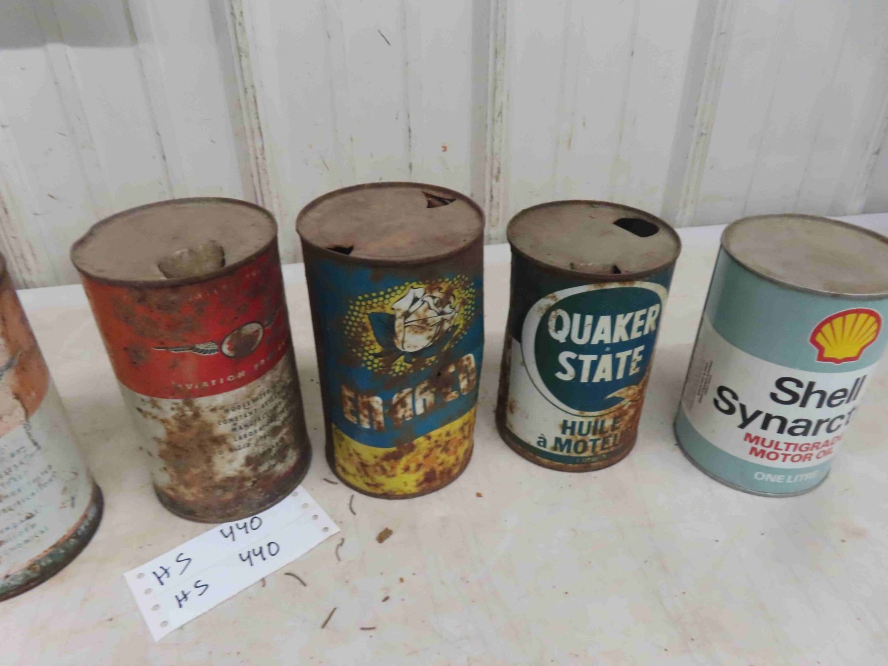 7 Quart Oil Cans : Mobil Oil, Co Op , Esso Aviation, Enarc, Quaker State, Shell, Some Clean Some Rusty