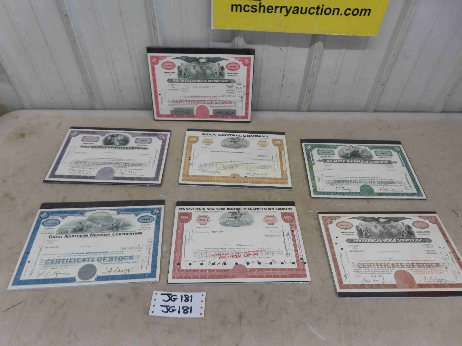 7 Stock Certificates ; 2 Pan American World Airlines, Atlantic Richfield Company, Pennsylvania New York Central, Great Northern Nekoosa, Penn Central, Gulf States Utilities