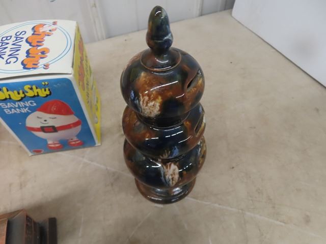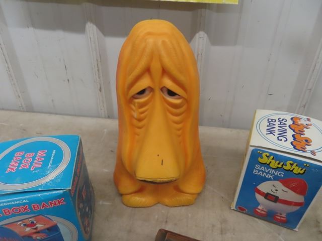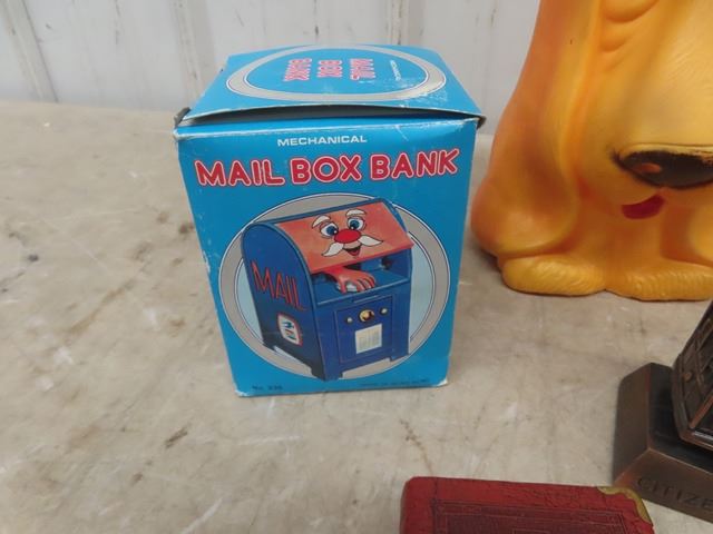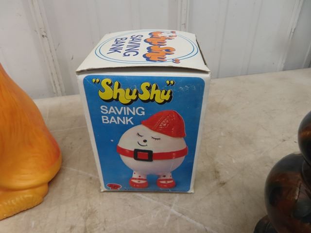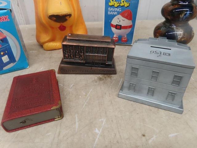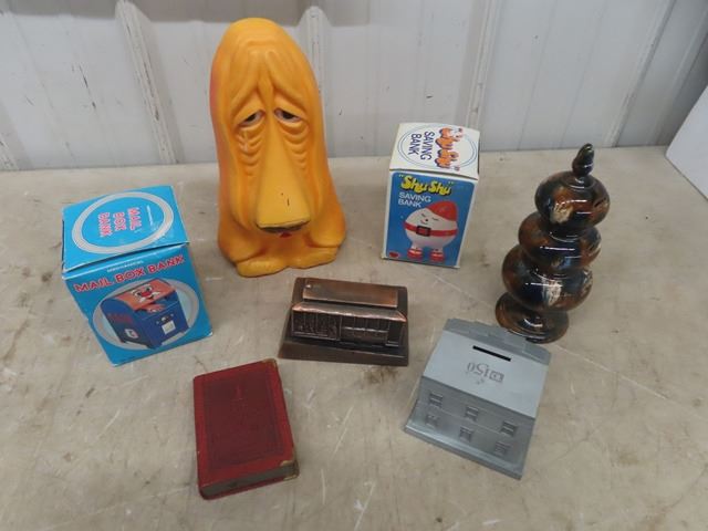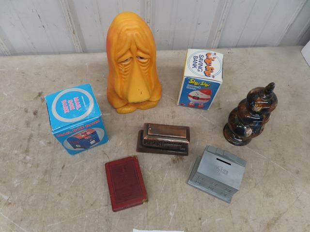 7 Vintage + Antique Savings Banks - Plastic, Metal, Pottery; 2 Banks have Original Boxes- 1 is Mecha