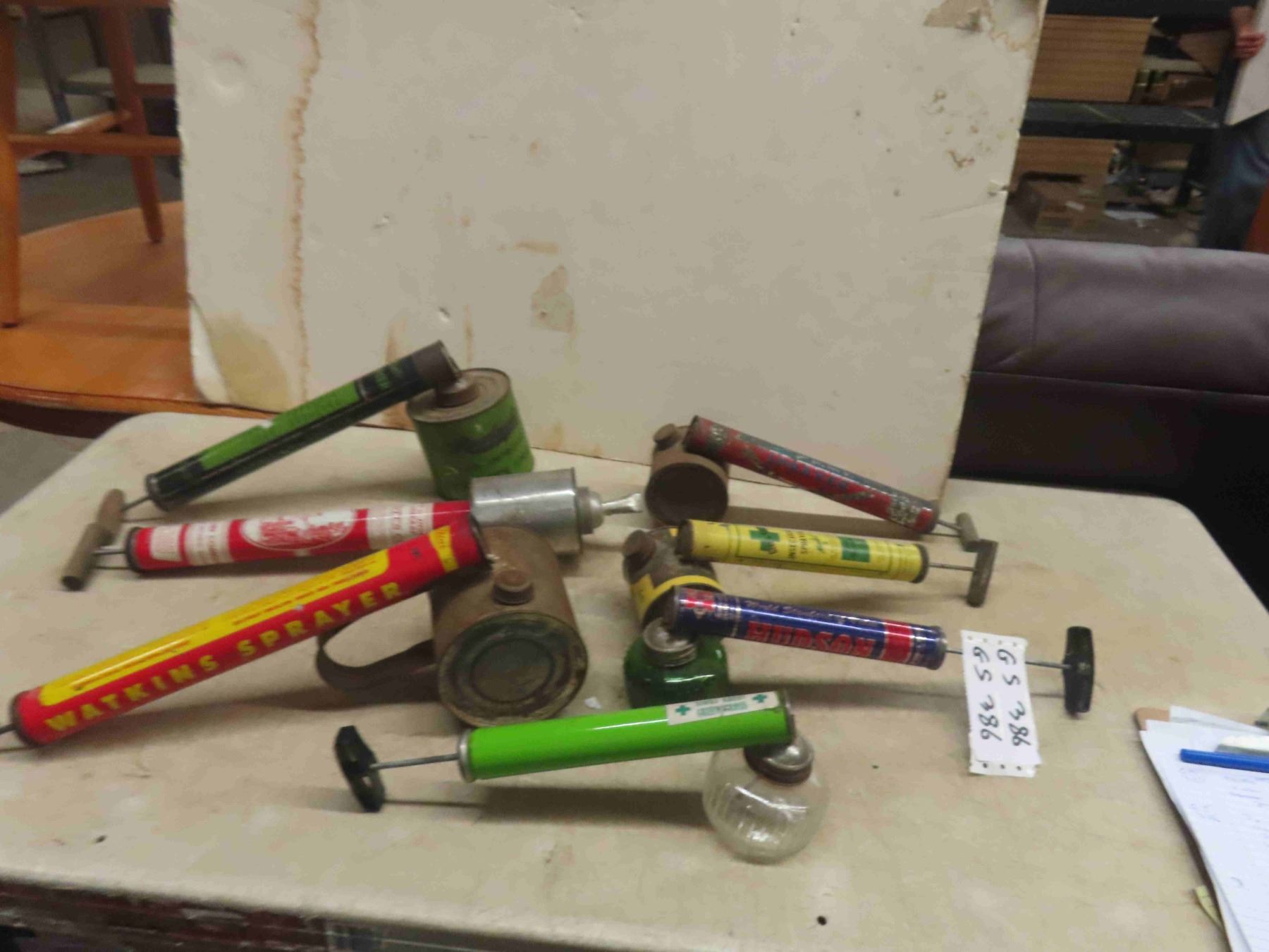 7 Vintage Bug Sprayers ; Rawleigh's, Scotts Cure, Watkins, Green Cross, Hudson, Universal