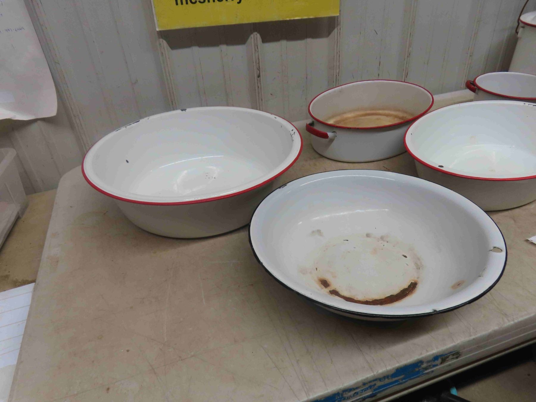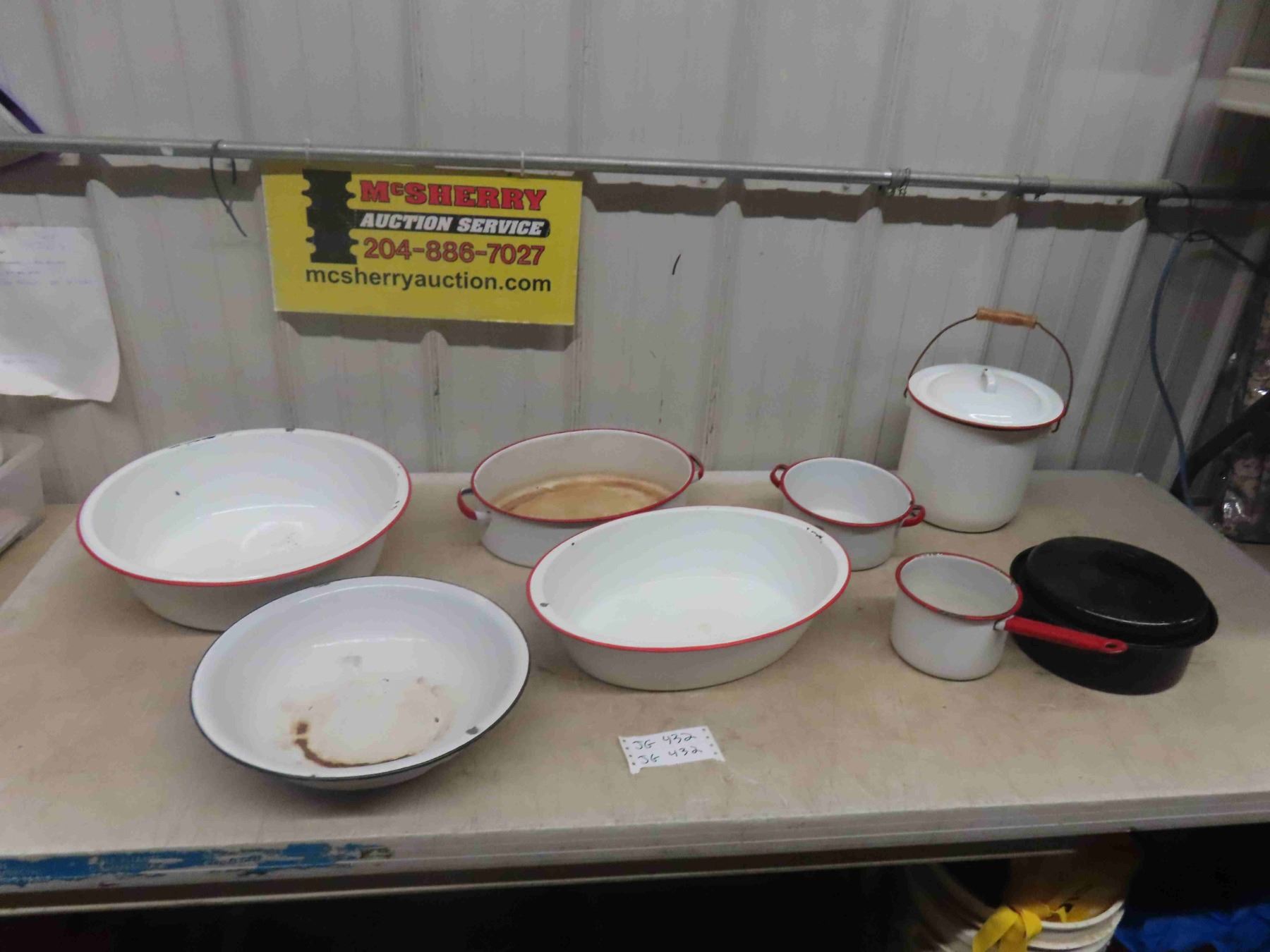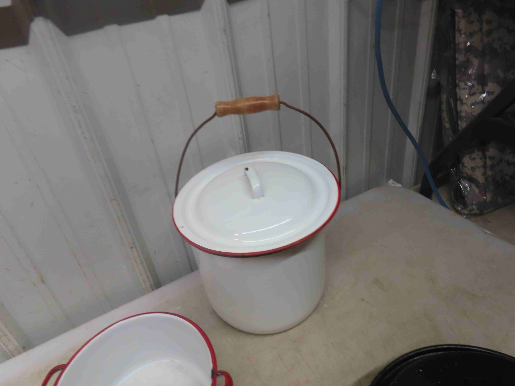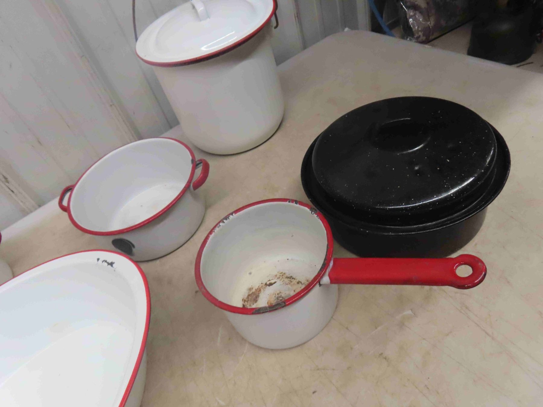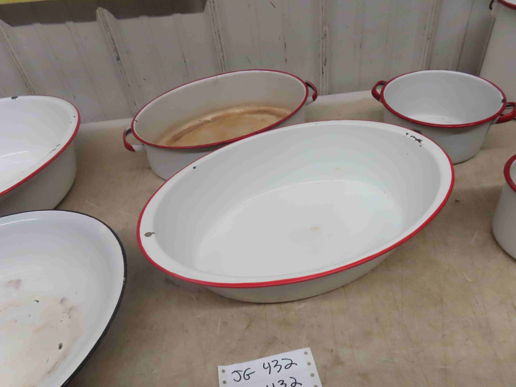 7 Vintage White Enamelware Pots, Large Basins + Roaster & Round Black Roaster