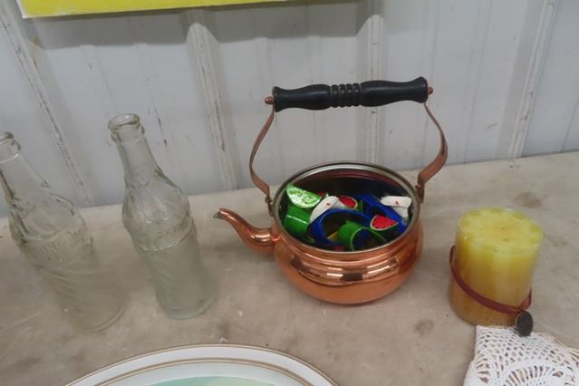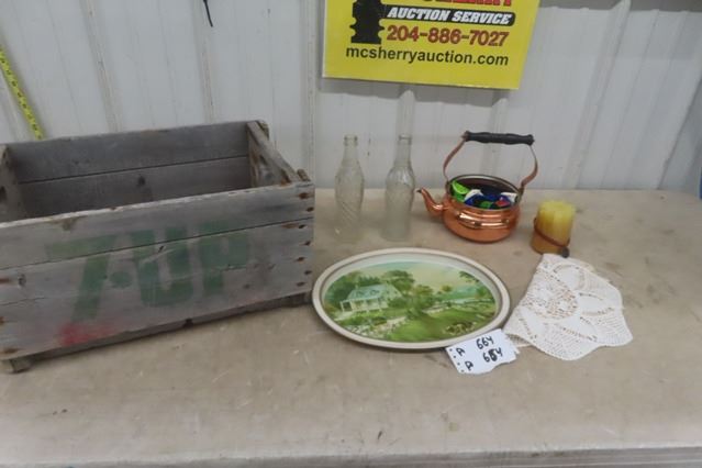7Up Crate, 2 Wishing Well Bottles, Tray, Copper Kettle plus more