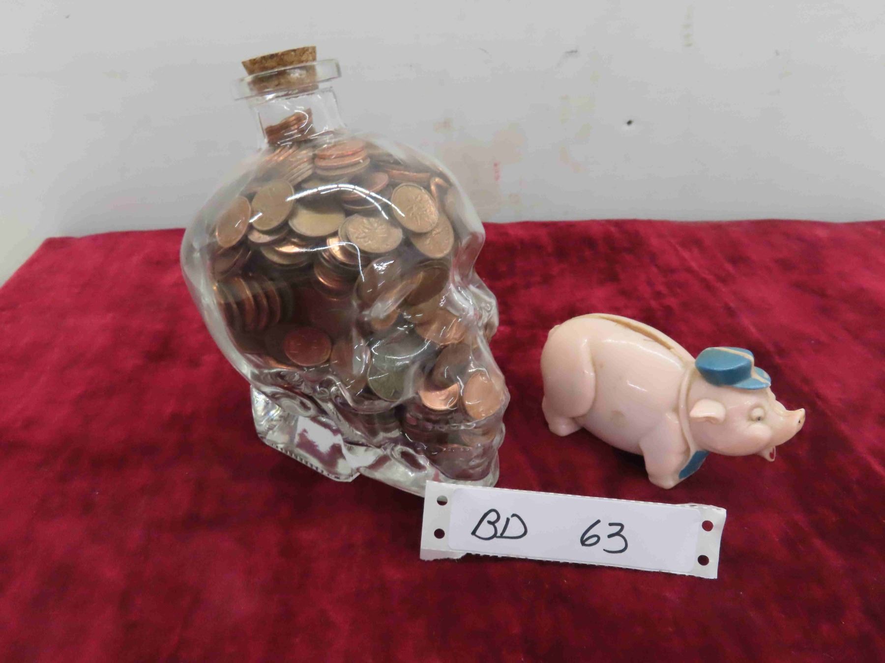7lbs of Pennies in Glass Skull + Small Piggy Bank with Pennies