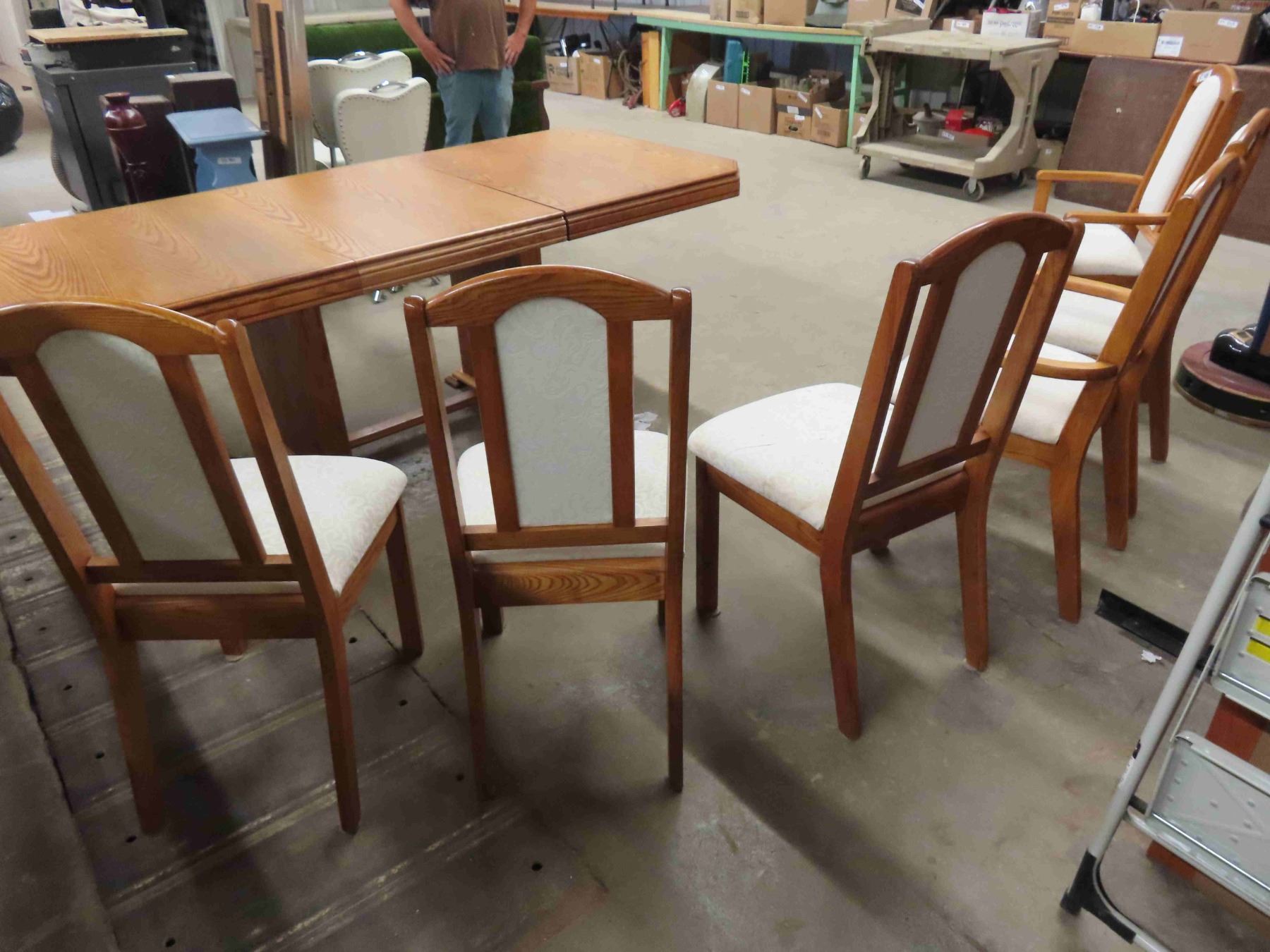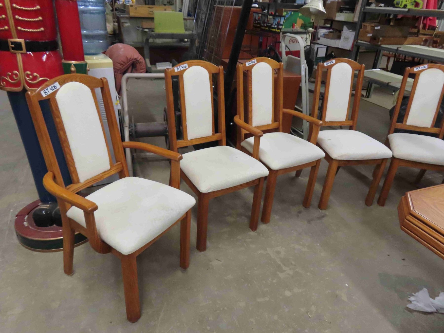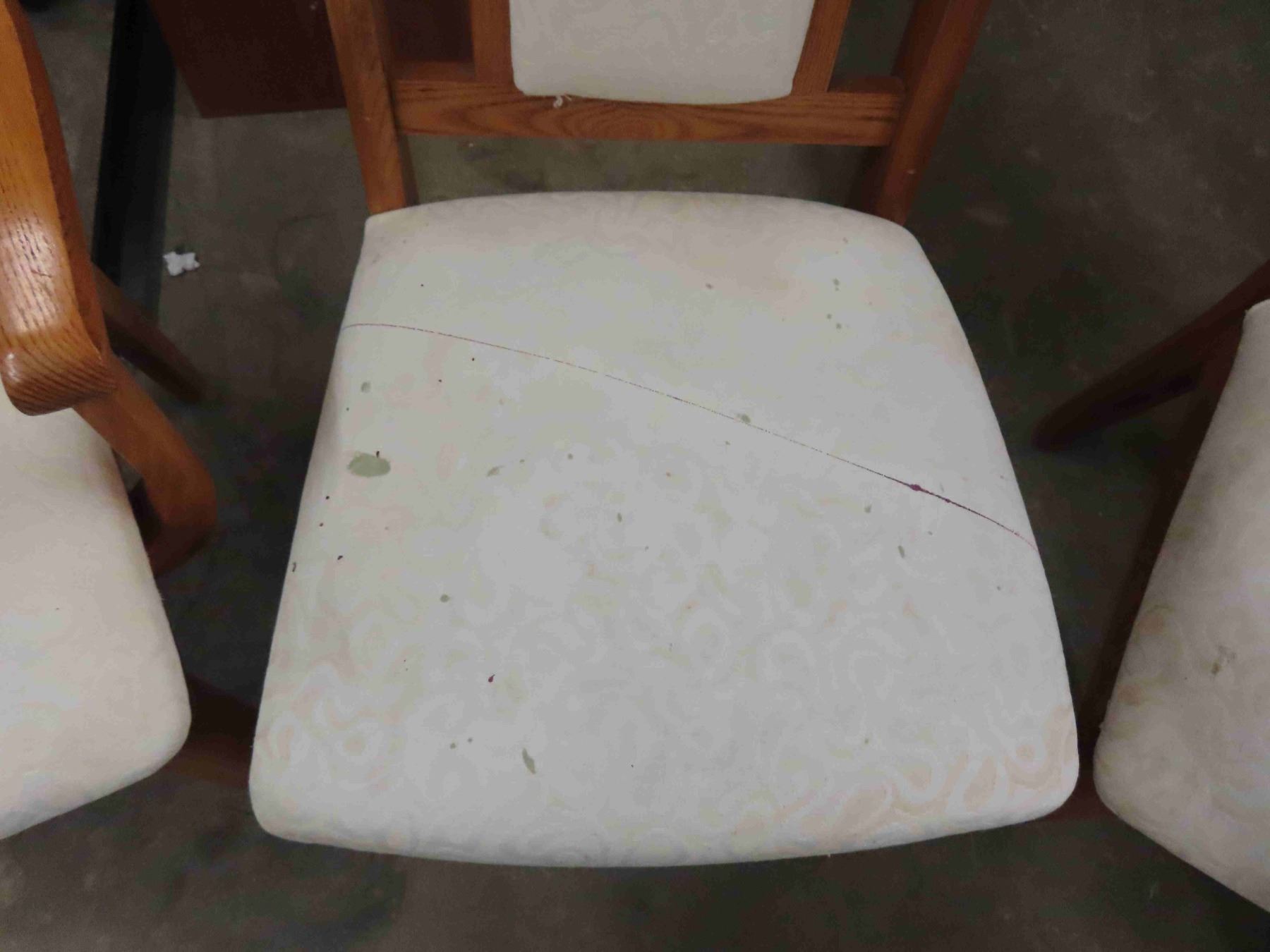 7pc Oak Dining Room Set ; 2 Captains Chairs, White Cloth Upholstery - With Leaf Table is 30" x 38" x 85"