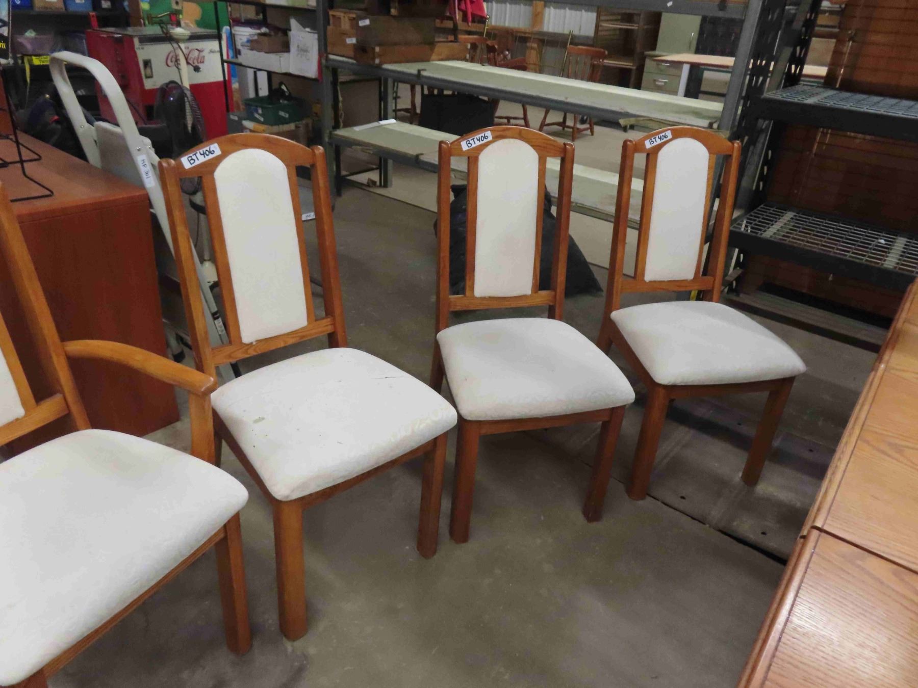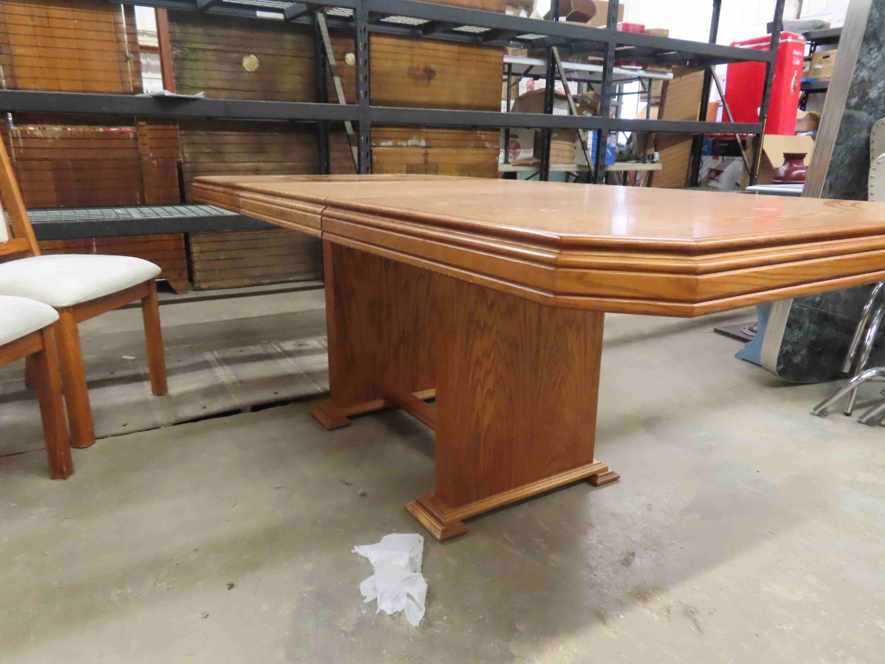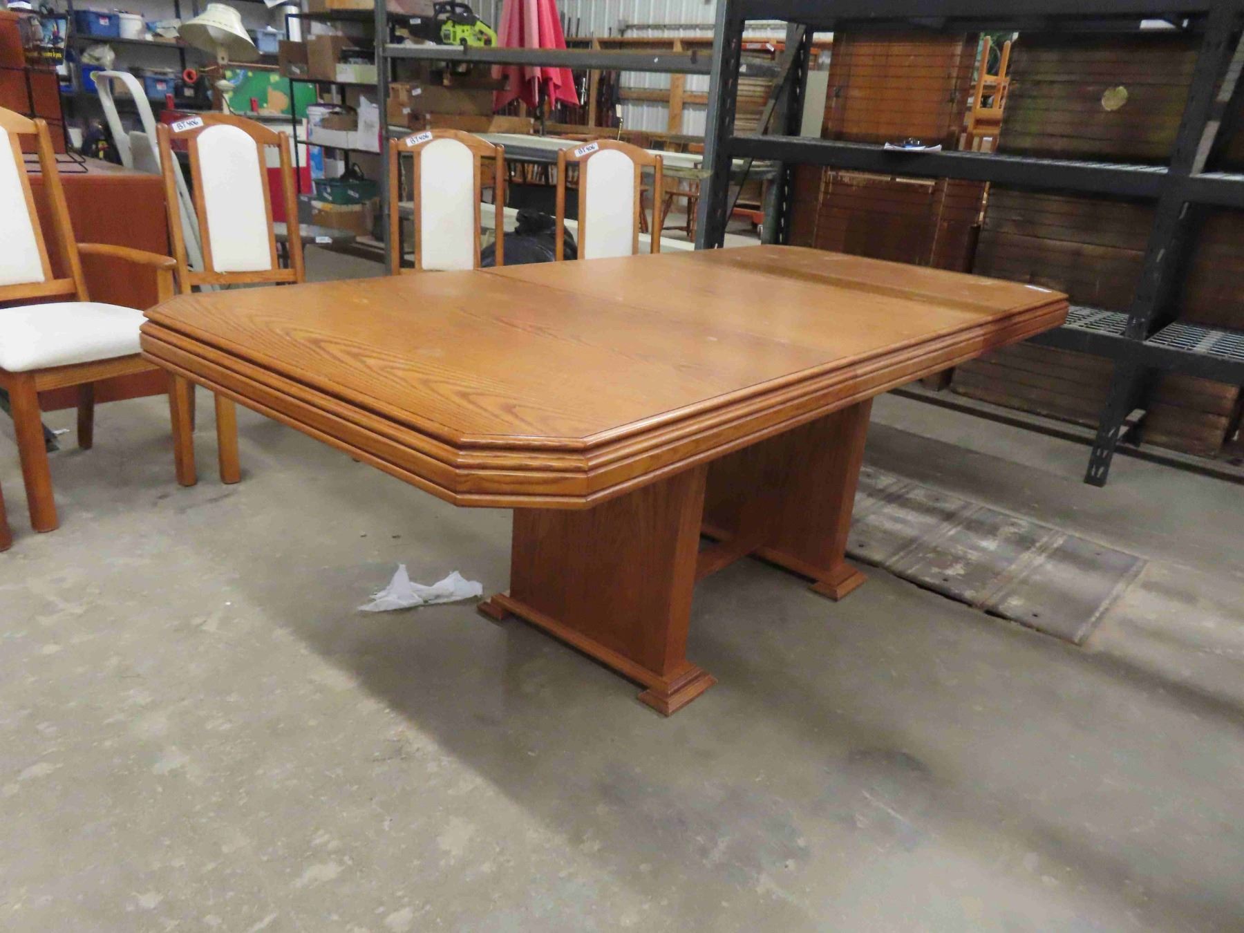 7pc Oak Dining Room Set ; 2 Captains Chairs, White Cloth Upholstery - With Leaf Table is 30" x 38" x 85"