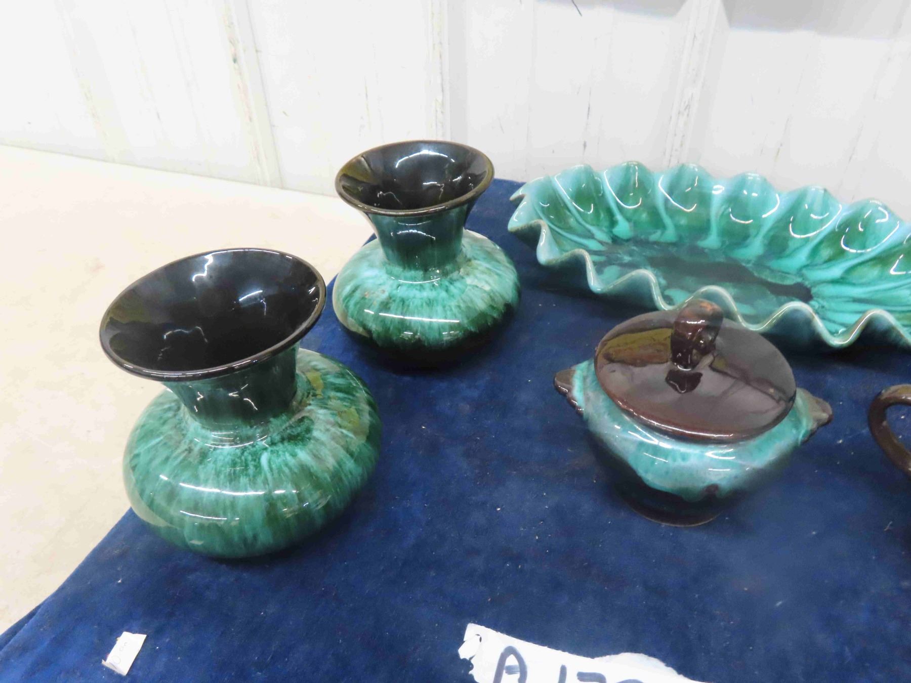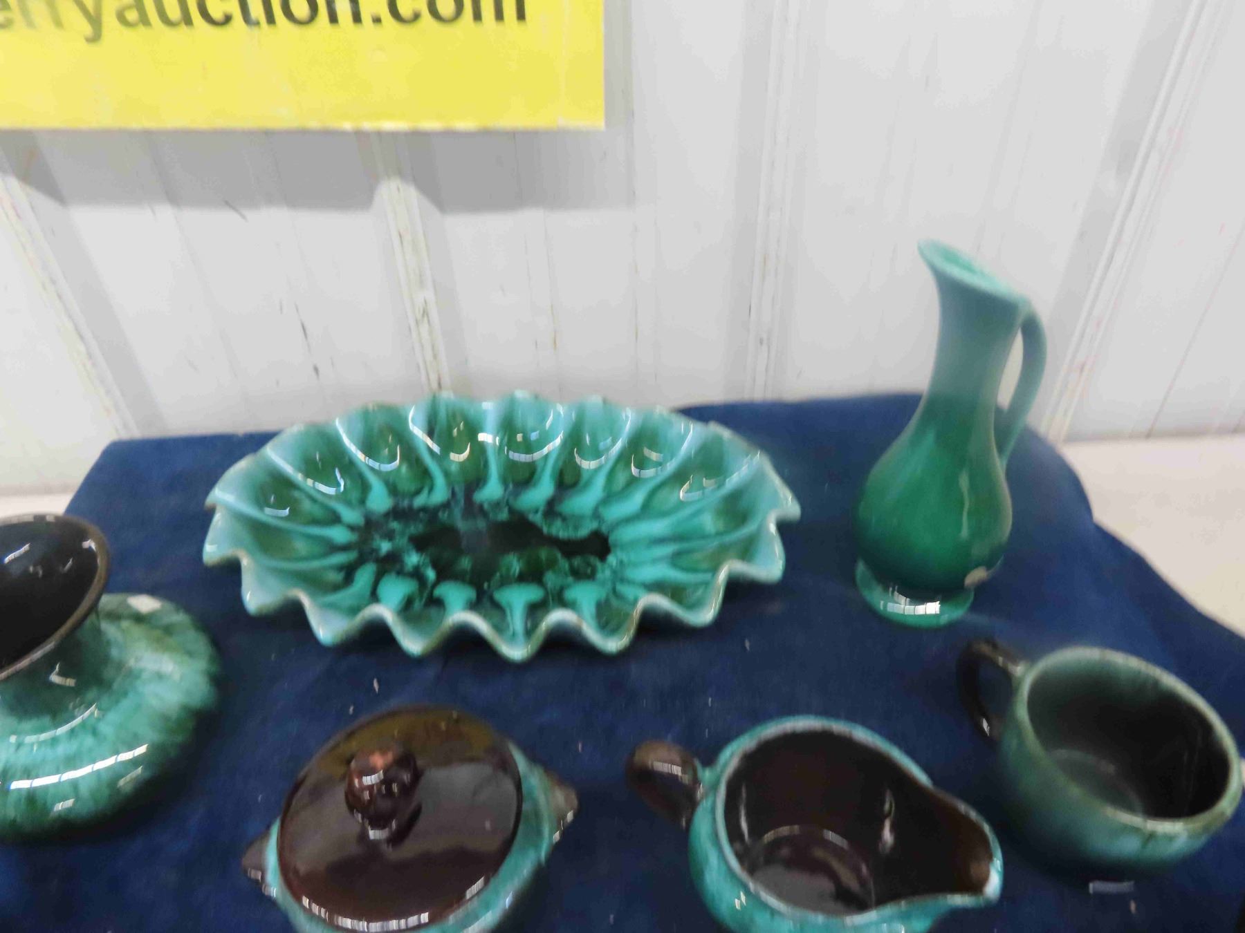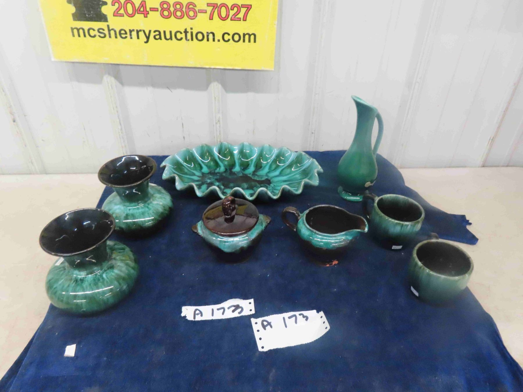 8 Blue Mountain Dishes ; Vase, Cream + Sugar, Cups