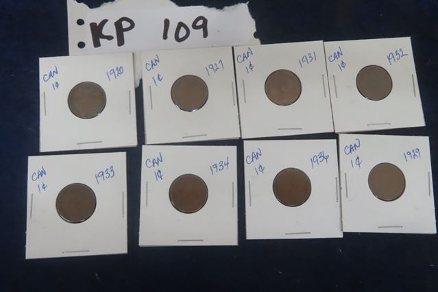 8 Canadian 1 Cent Coins - 1920, 1927, 1929, 1931, 1932, 1934, 1936