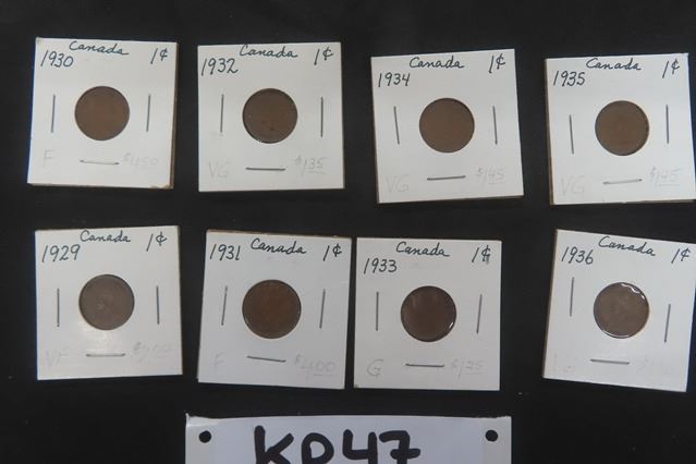 8 Canadian 1 cent Coins ; 1926 - 1936