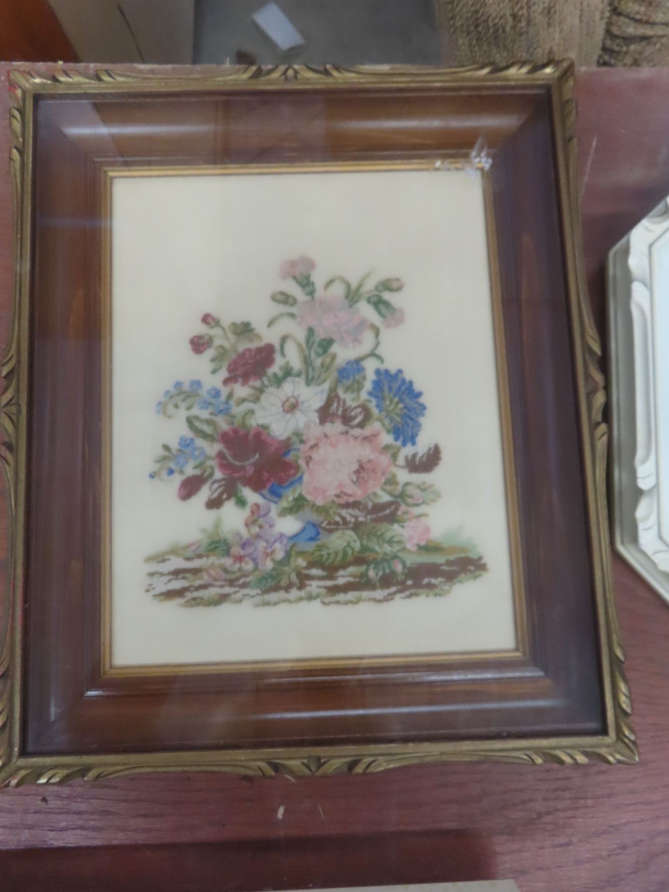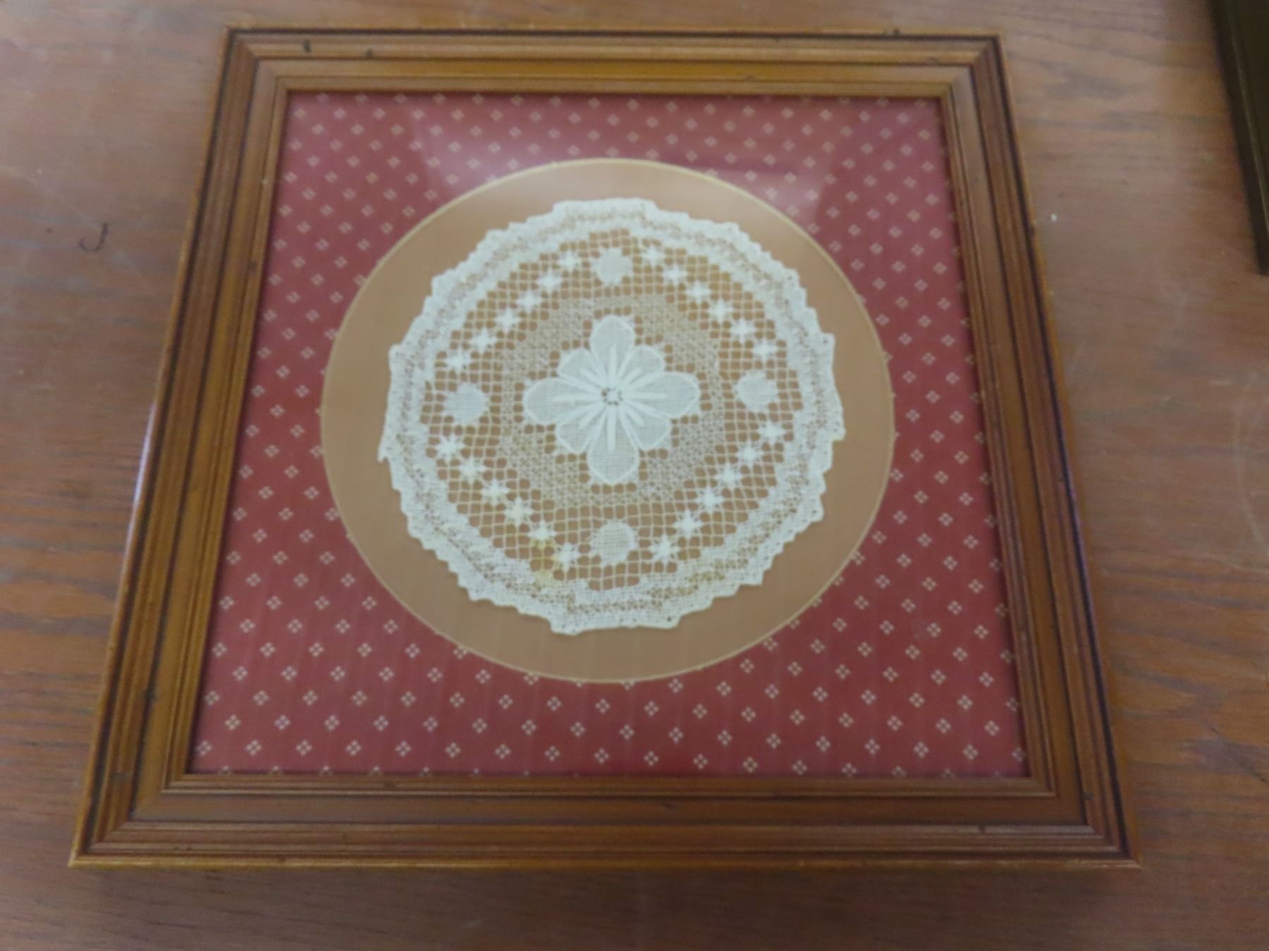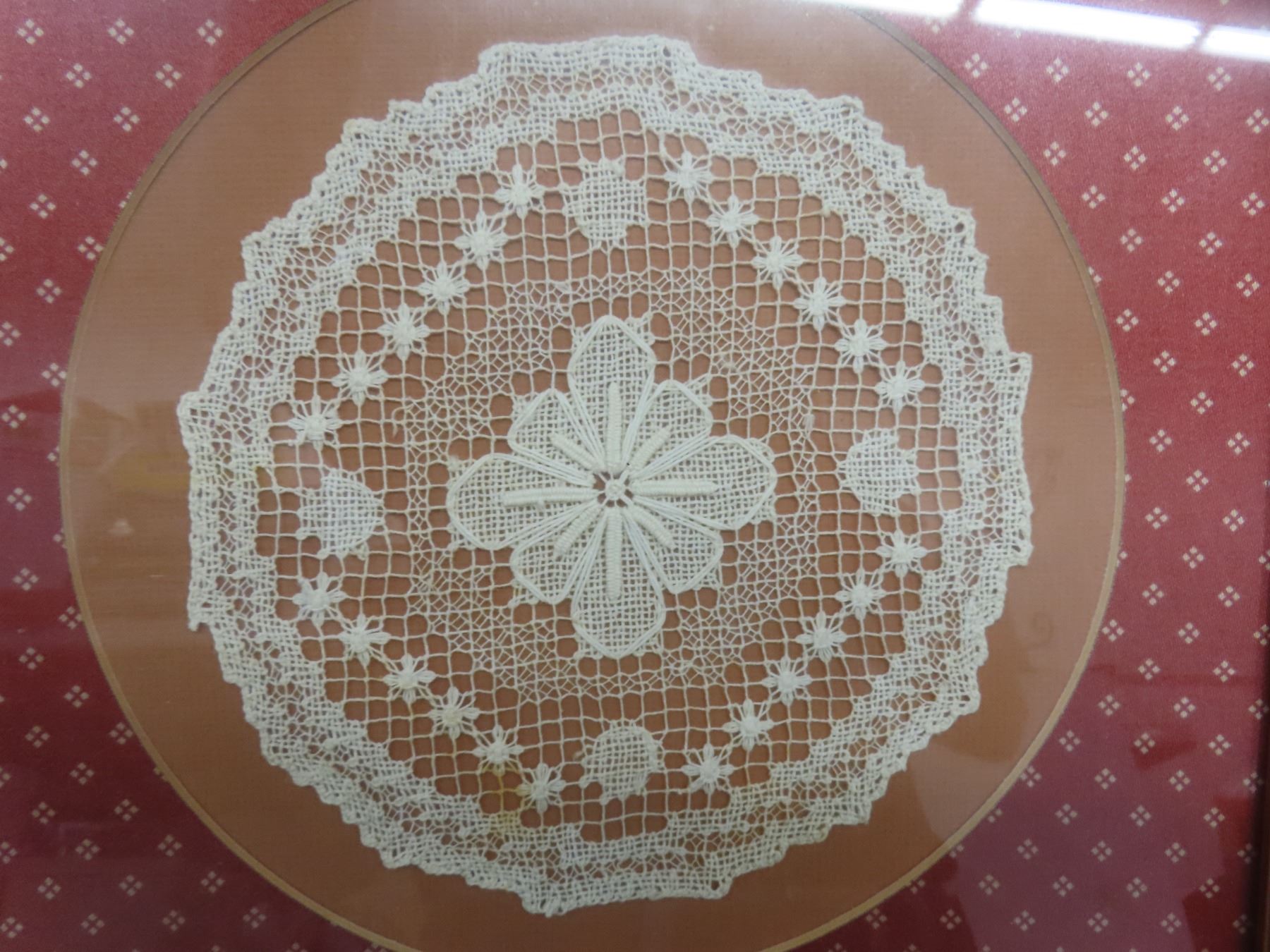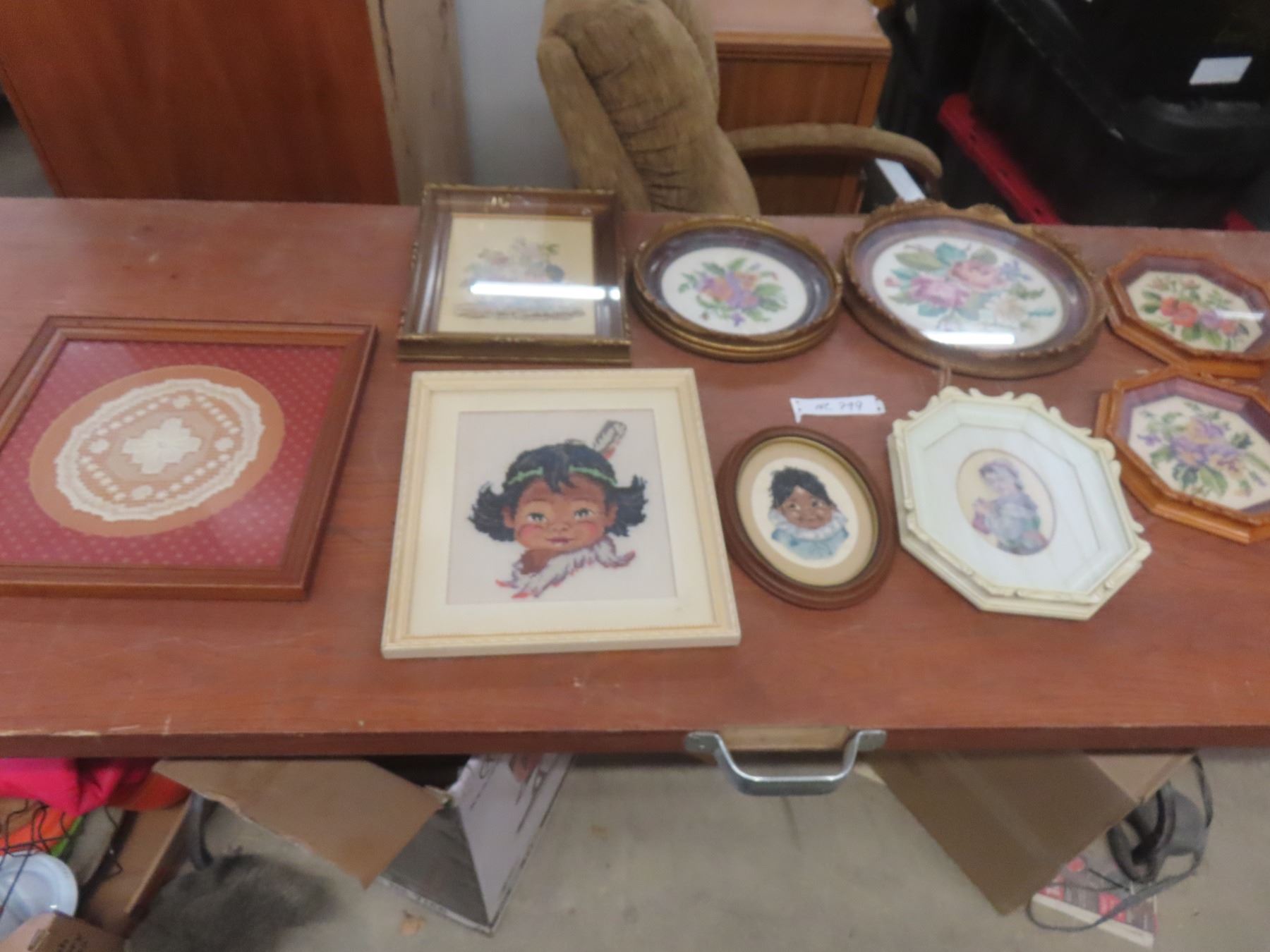 8 Cross Stick/Petit Point Framed Pictures and Antique Georgan Lace