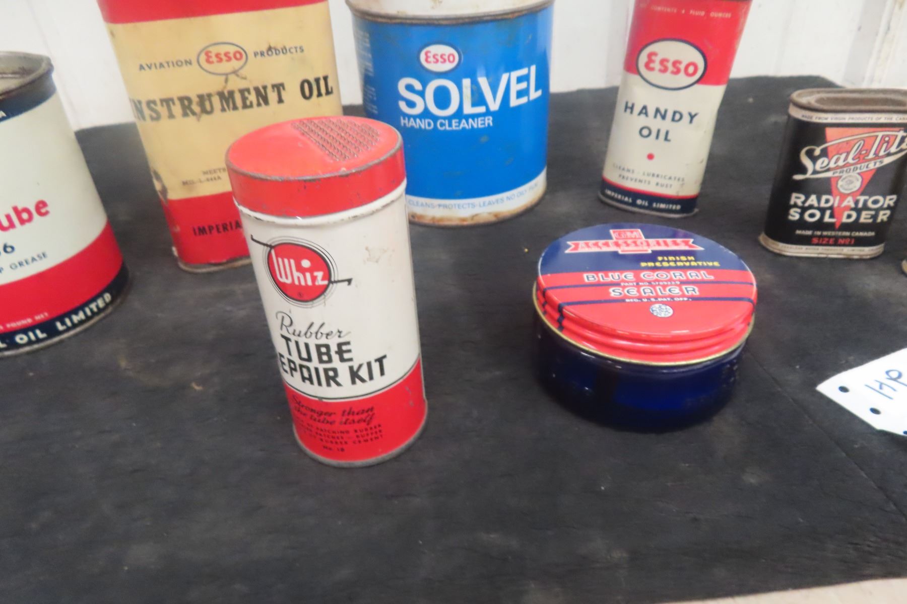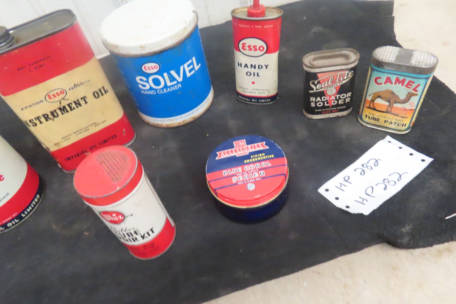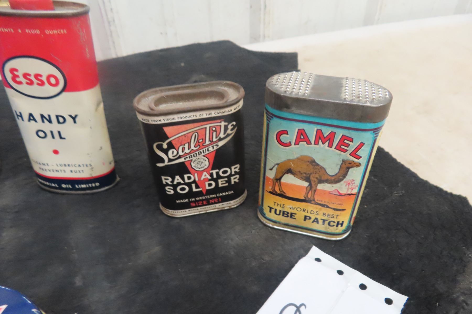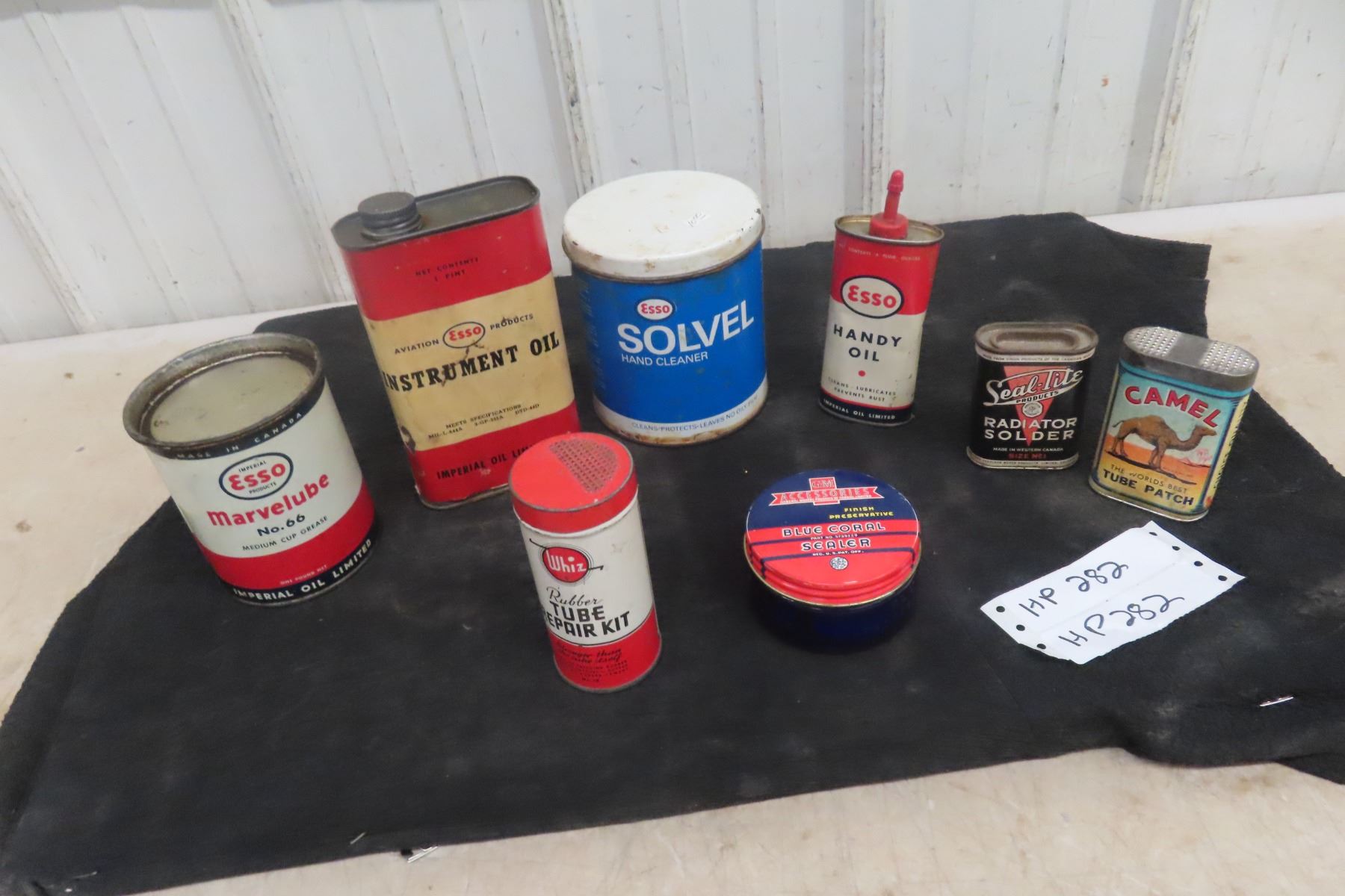 (8) Garage Cans: Camel Tube Patch, Esso Handy Oil, Whiz, GM,