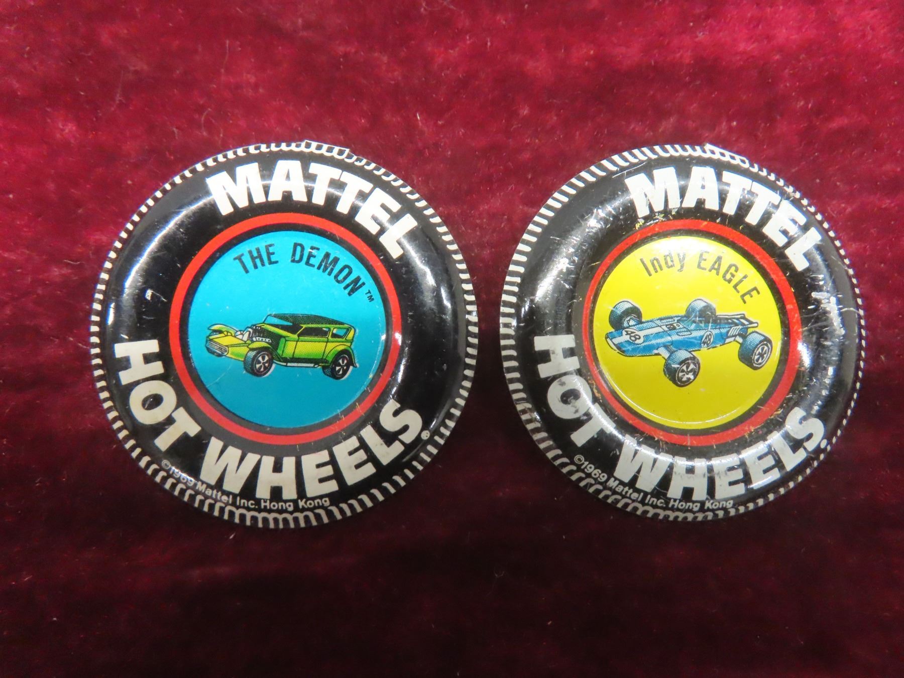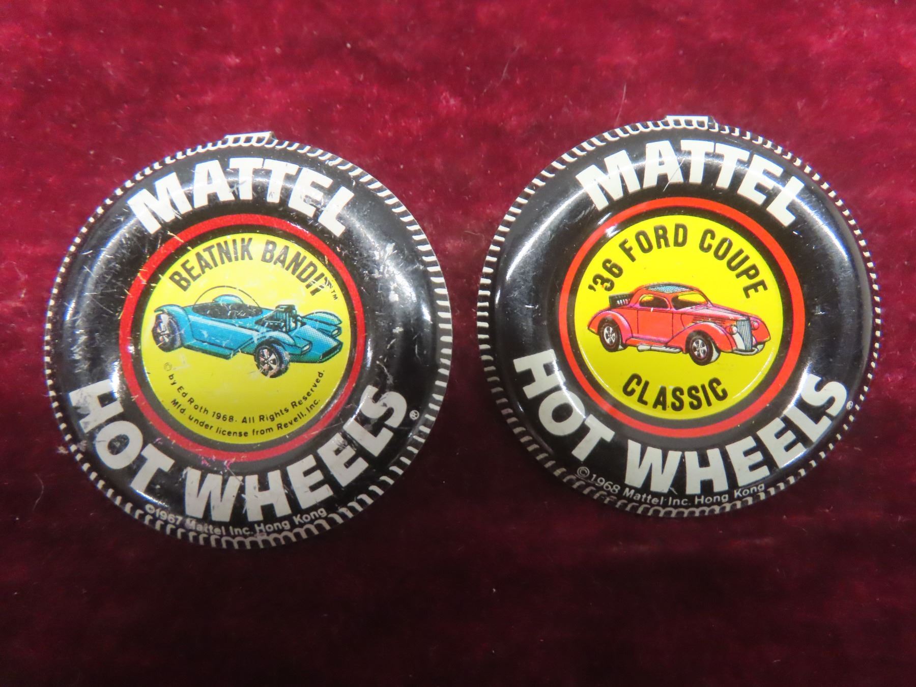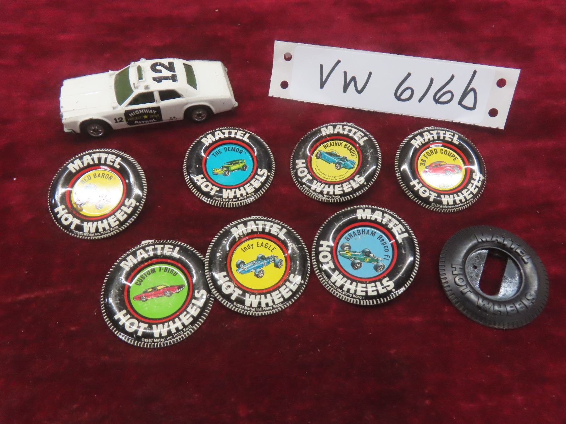 8 Mattel Hot Wheel Collector Buttons (1969) And A Highway Patrol Car.