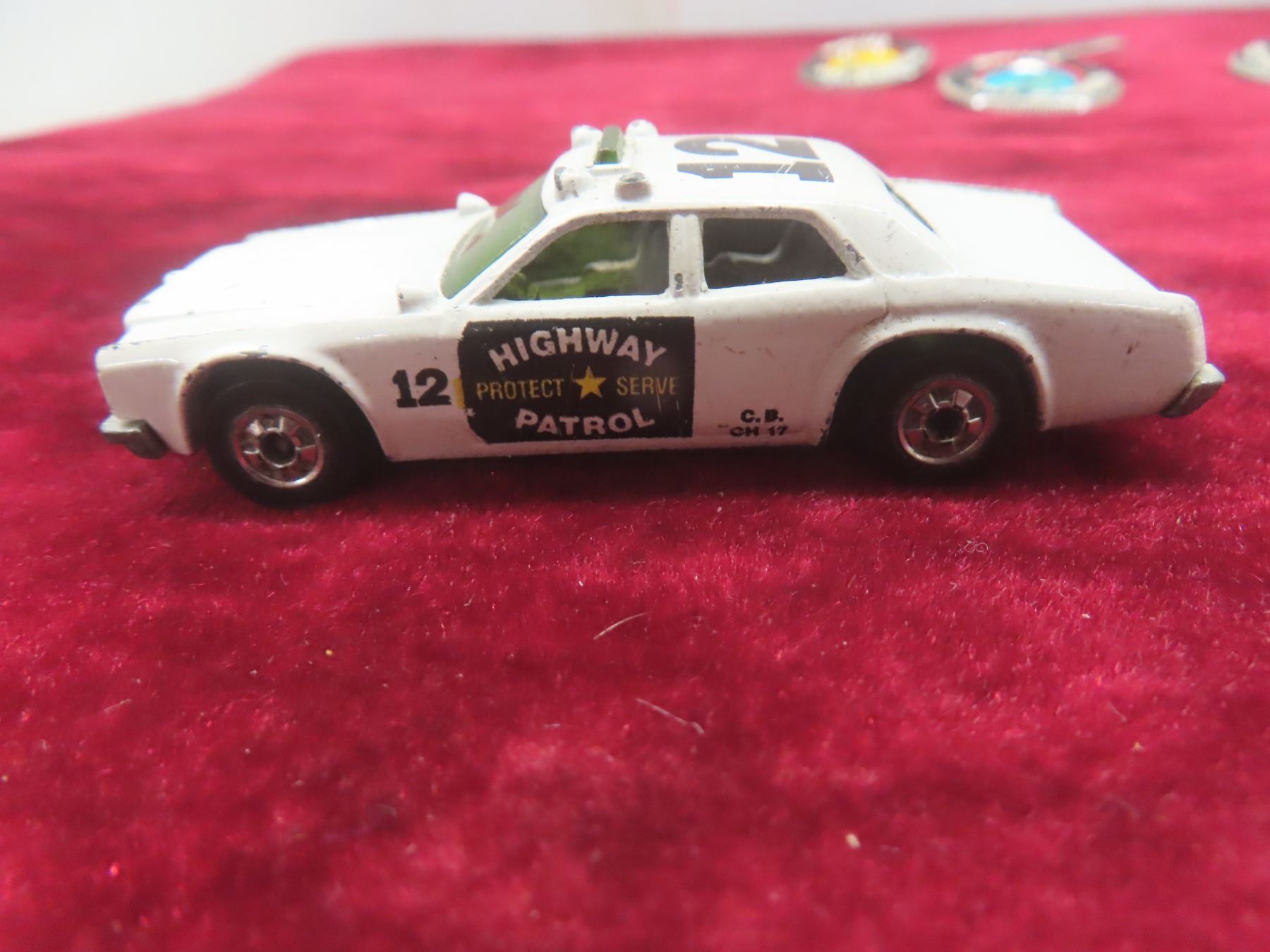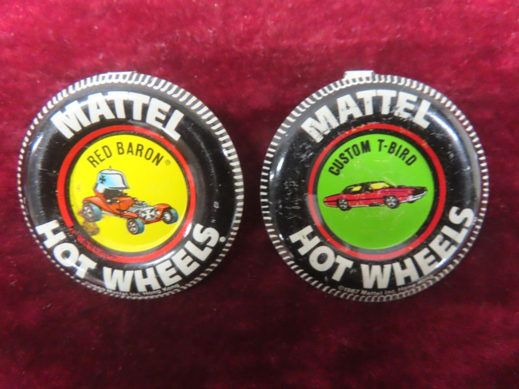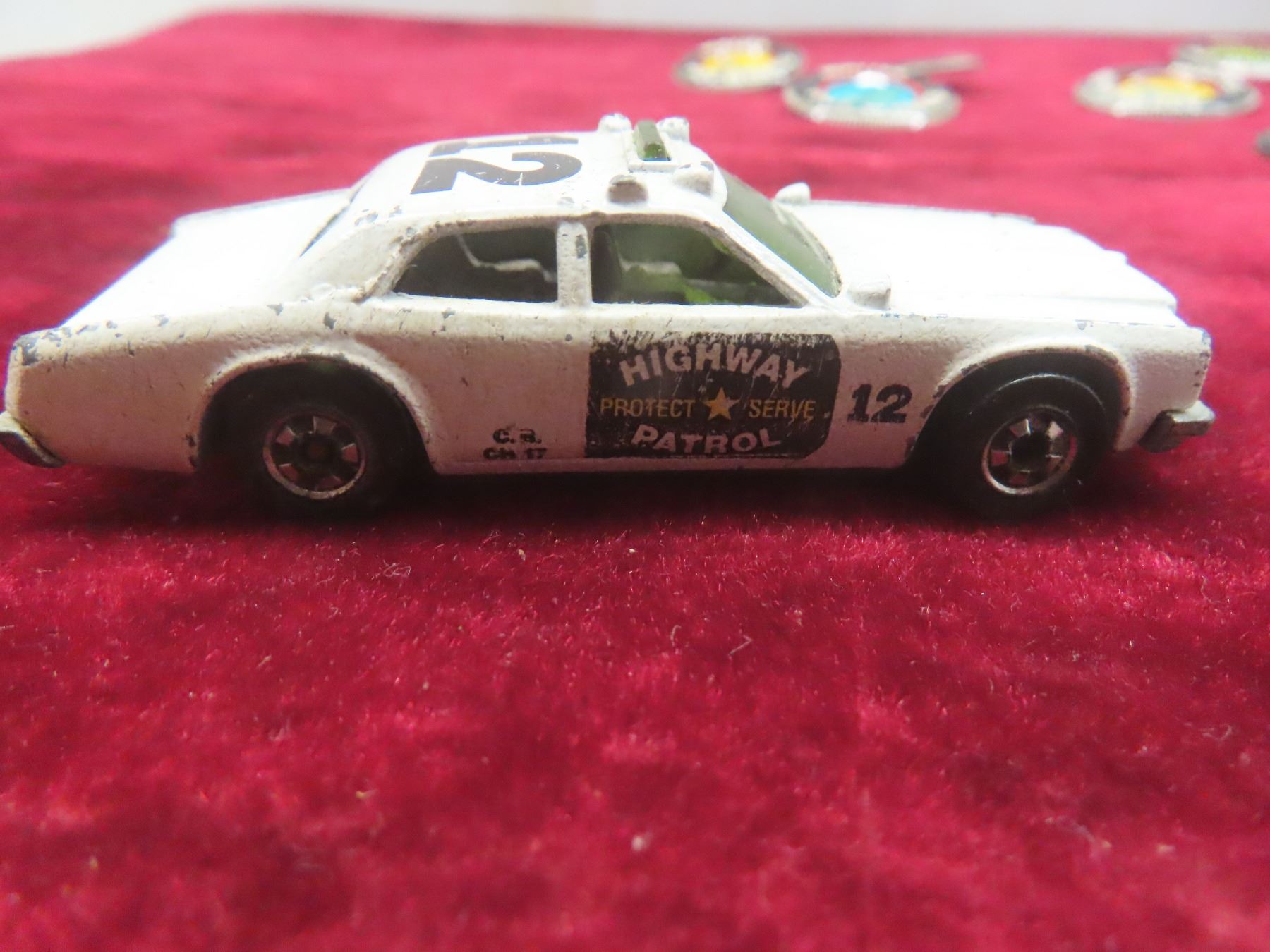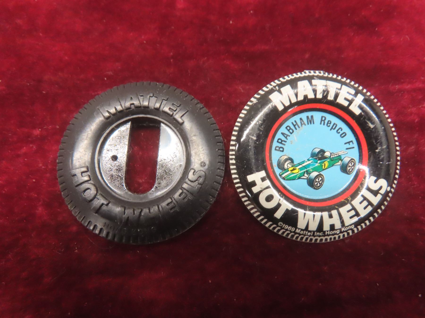 8 Mattel Hot Wheel Collector Buttons (1969) And A Highway Patrol Car.
