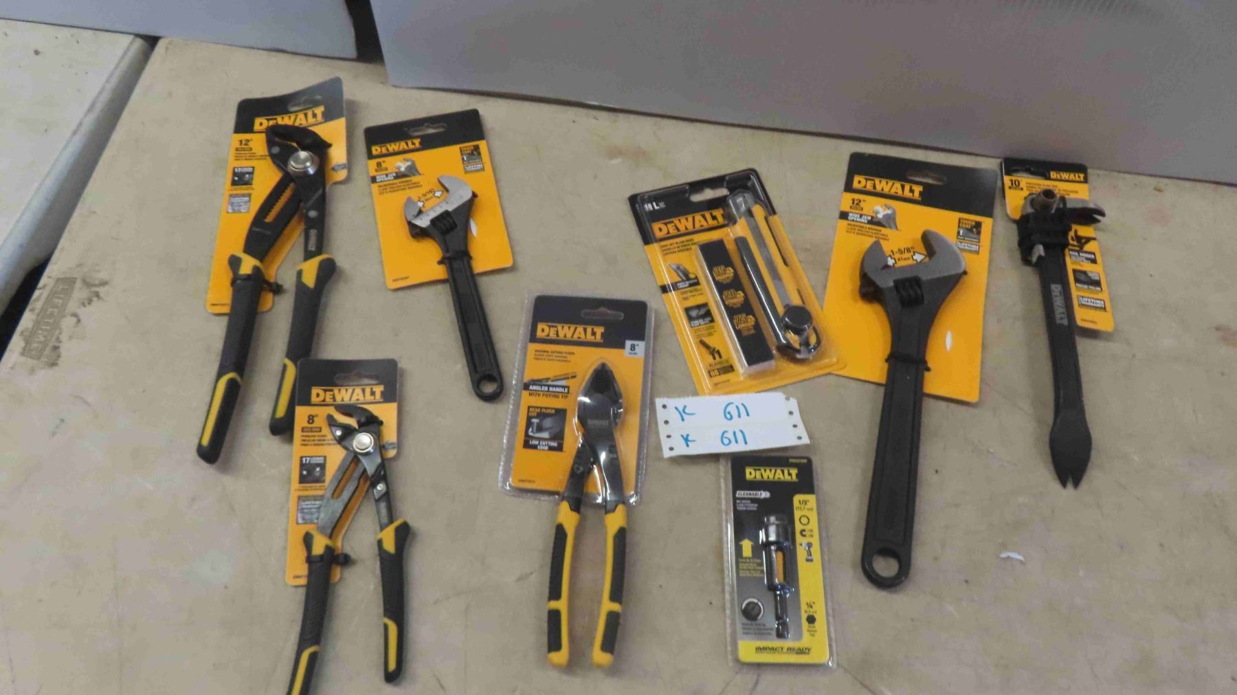8 New in Package Dewalt Tools: 12'' & 8'' Plyers, Cutting Plyers, 8'' & 10'' Adjustable Wrenches , 10'' Claw Bar, Nut Driver, Snap Off Blade Knife
