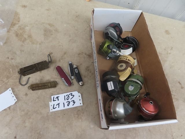 8 Spin Cast Reels - Zebco, Johnson, Old Pocket Knives & 2 Fish Scales