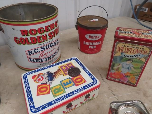 8 VIntage Tins, Wooden Crate, Rogers Sugar, Bee Hive Honey, Rawleighs