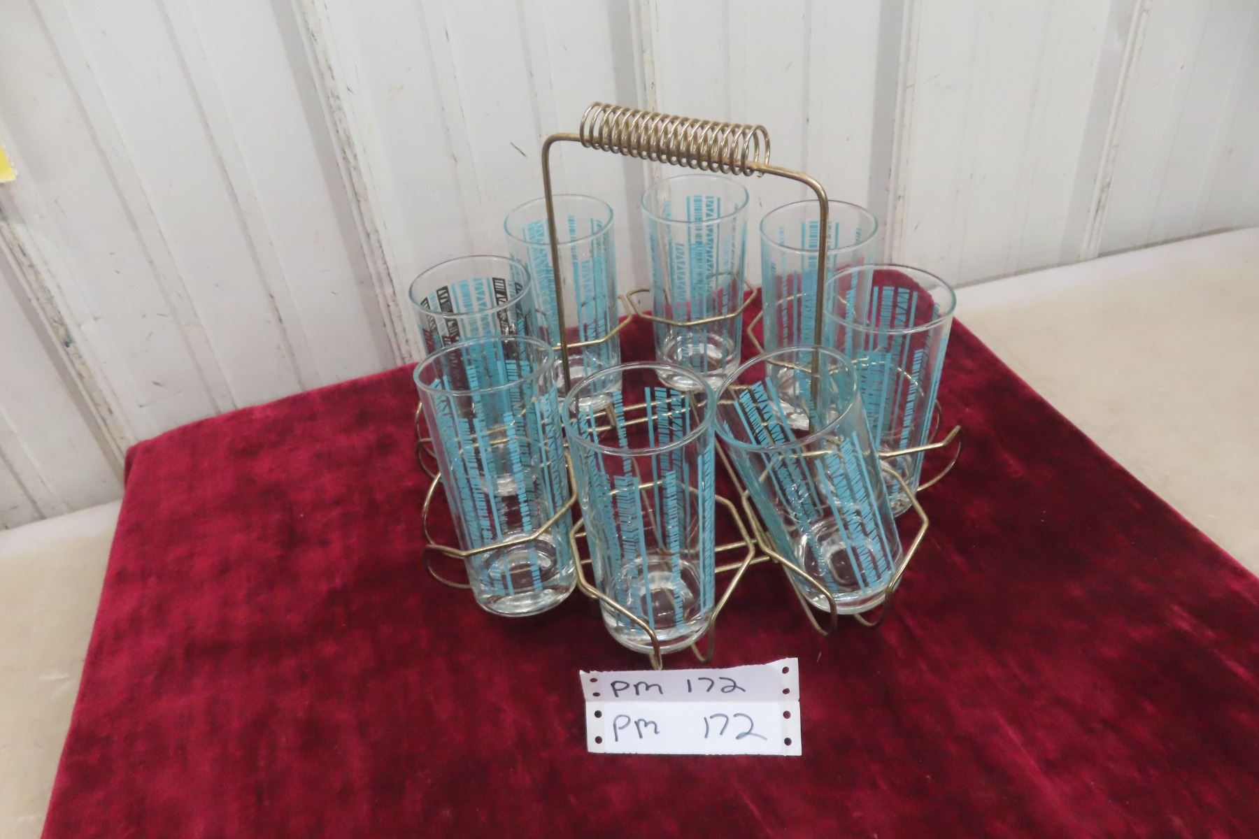 8 Vintage Tumblers with Carrier, Mid Century Modern.