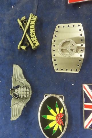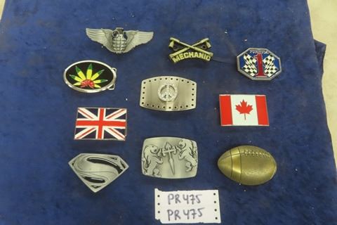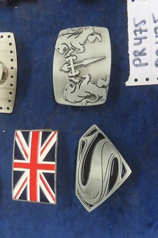9 Assorted Belt Buckles: Union Jack, Canada Flag, Superman plus more