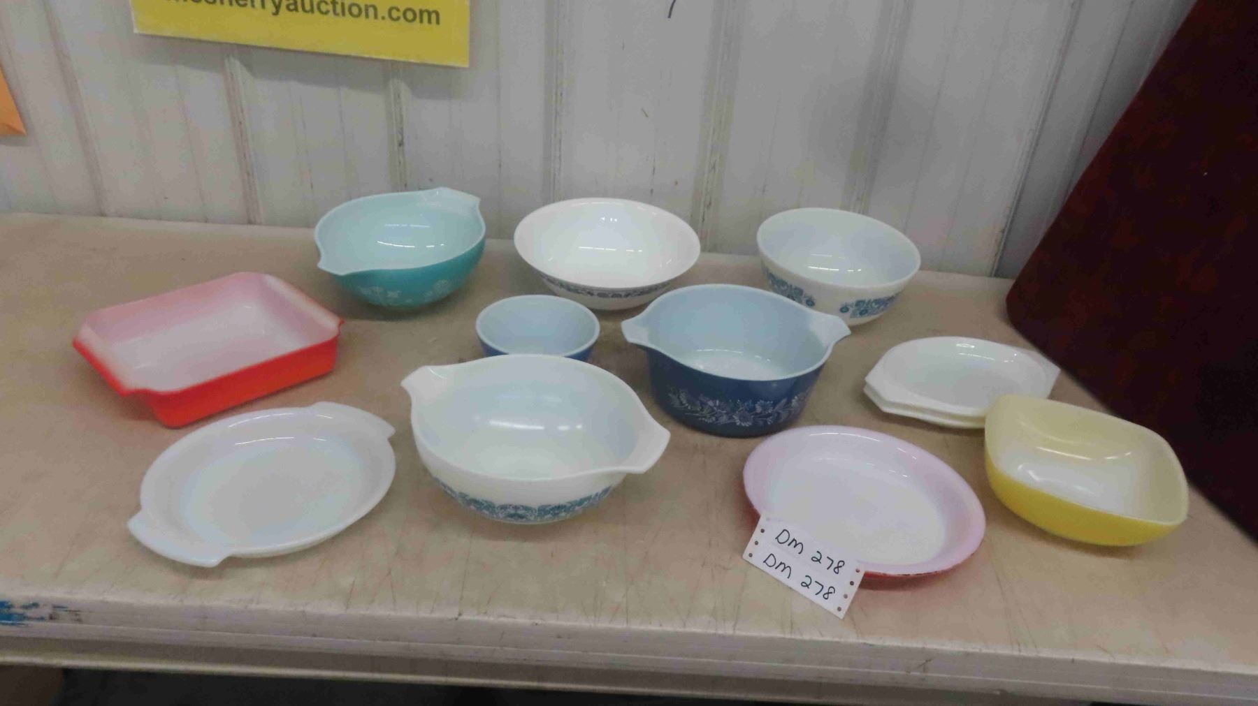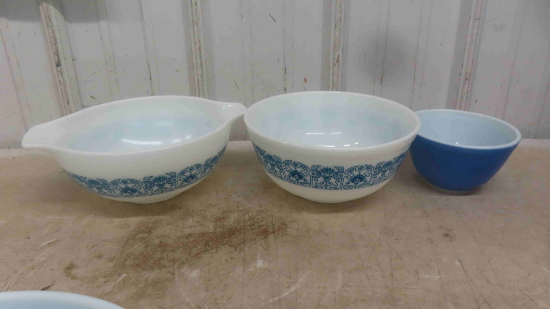 9 Pieces of Pyrex Including Mixing Bowls, Pie Plate, 2 Pieces of Fire