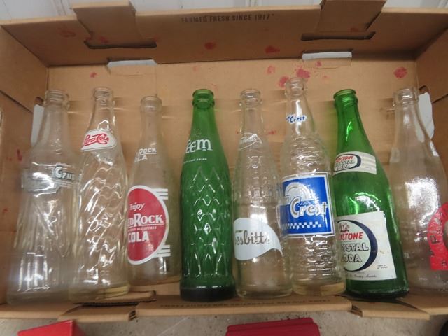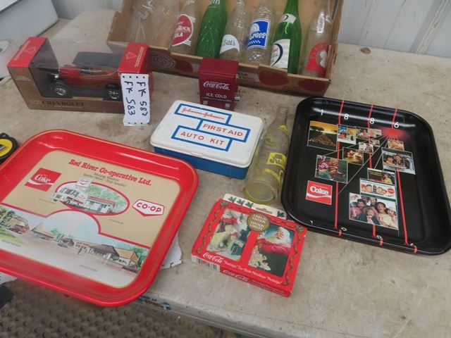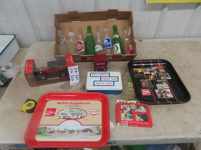 9 Pop Bottles; Crush, Team, Suncrest plus others + 2 Coke Trays, Auto 1st Aid Kit, Canadian Tire 192