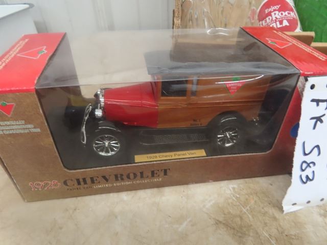 9 Pop Bottles; Crush, Team, Suncrest plus others + 2 Coke Trays, Auto 1st Aid Kit, Canadian Tire 1928 Chevy 1/24 Scale