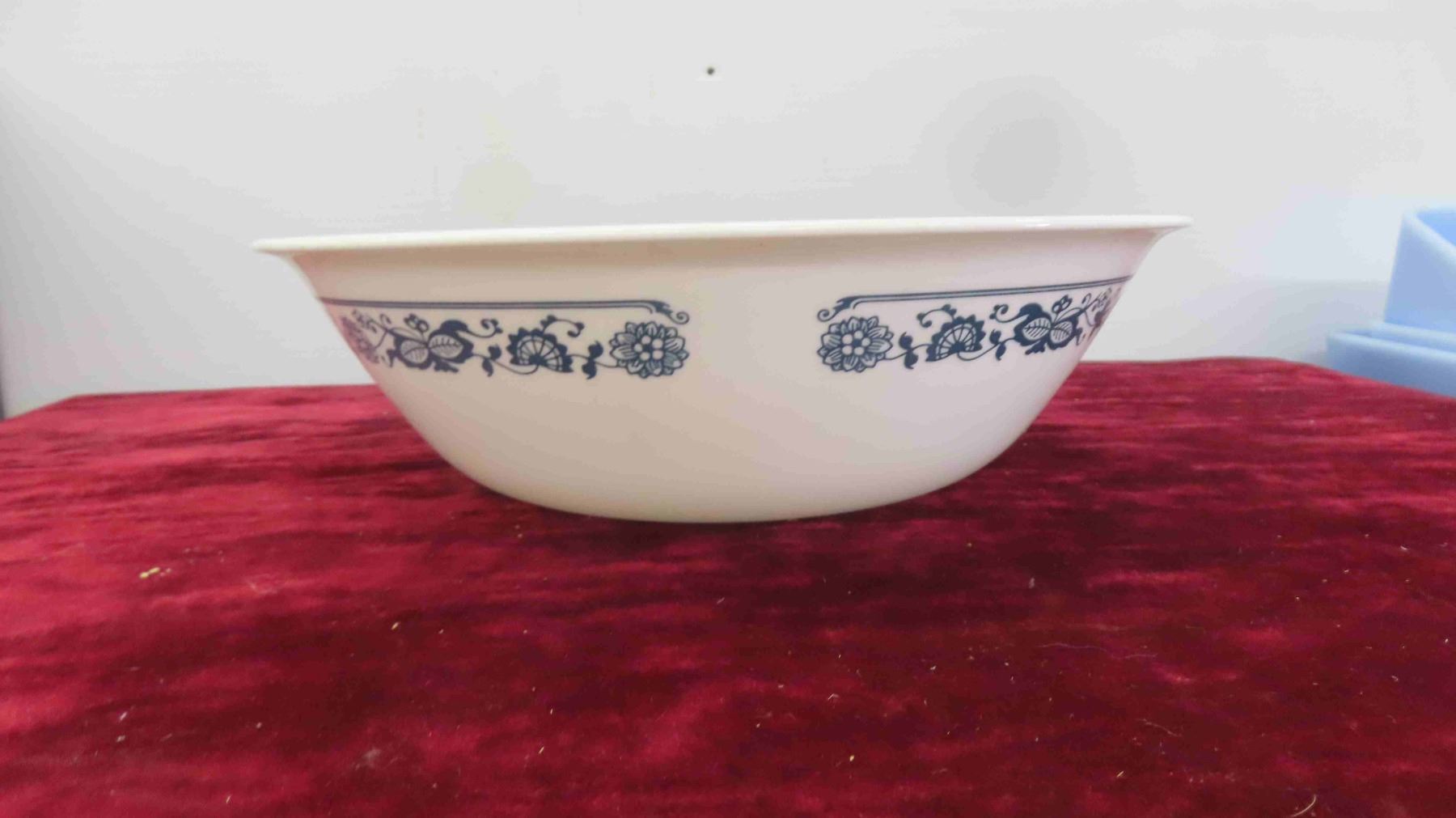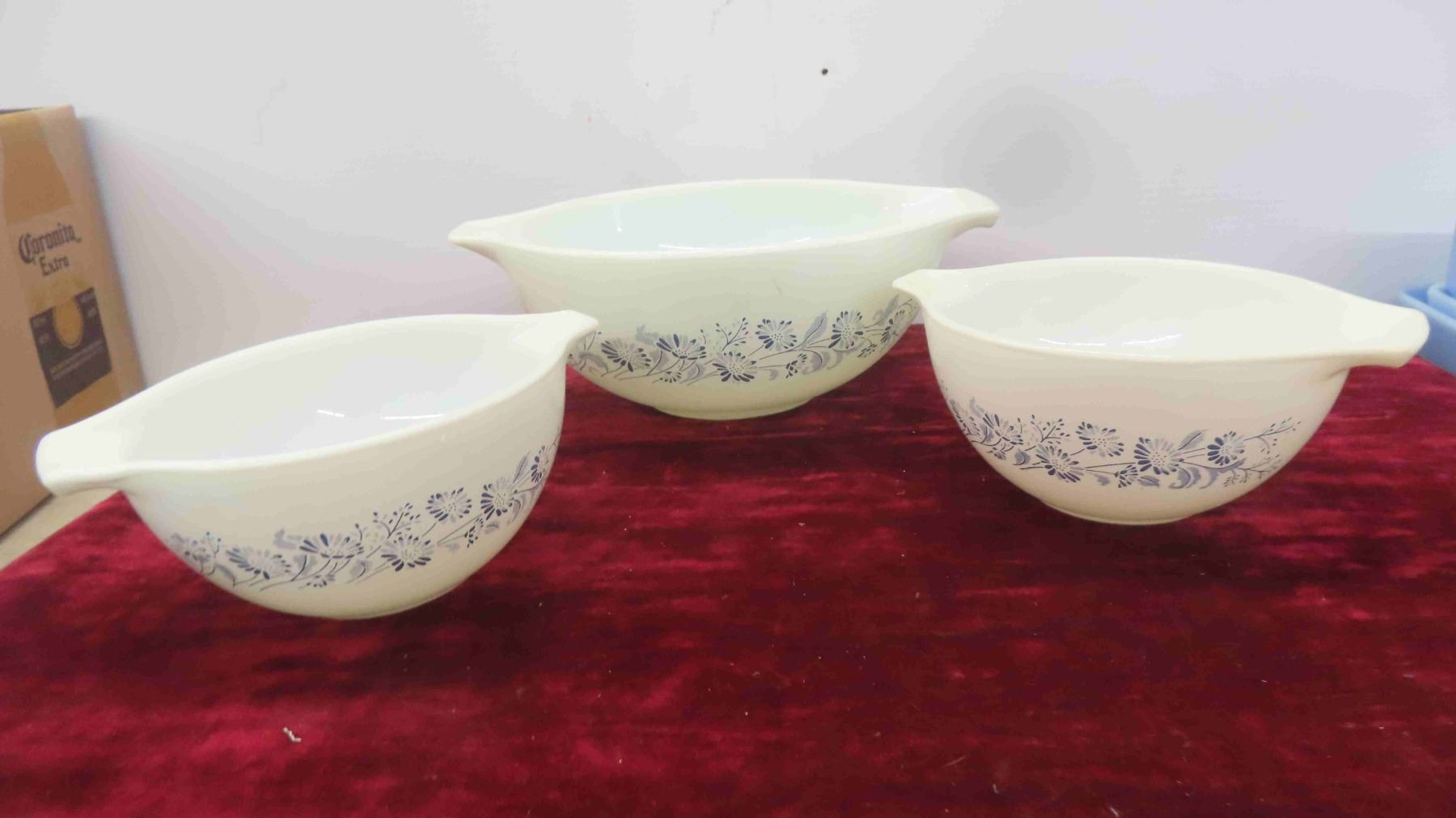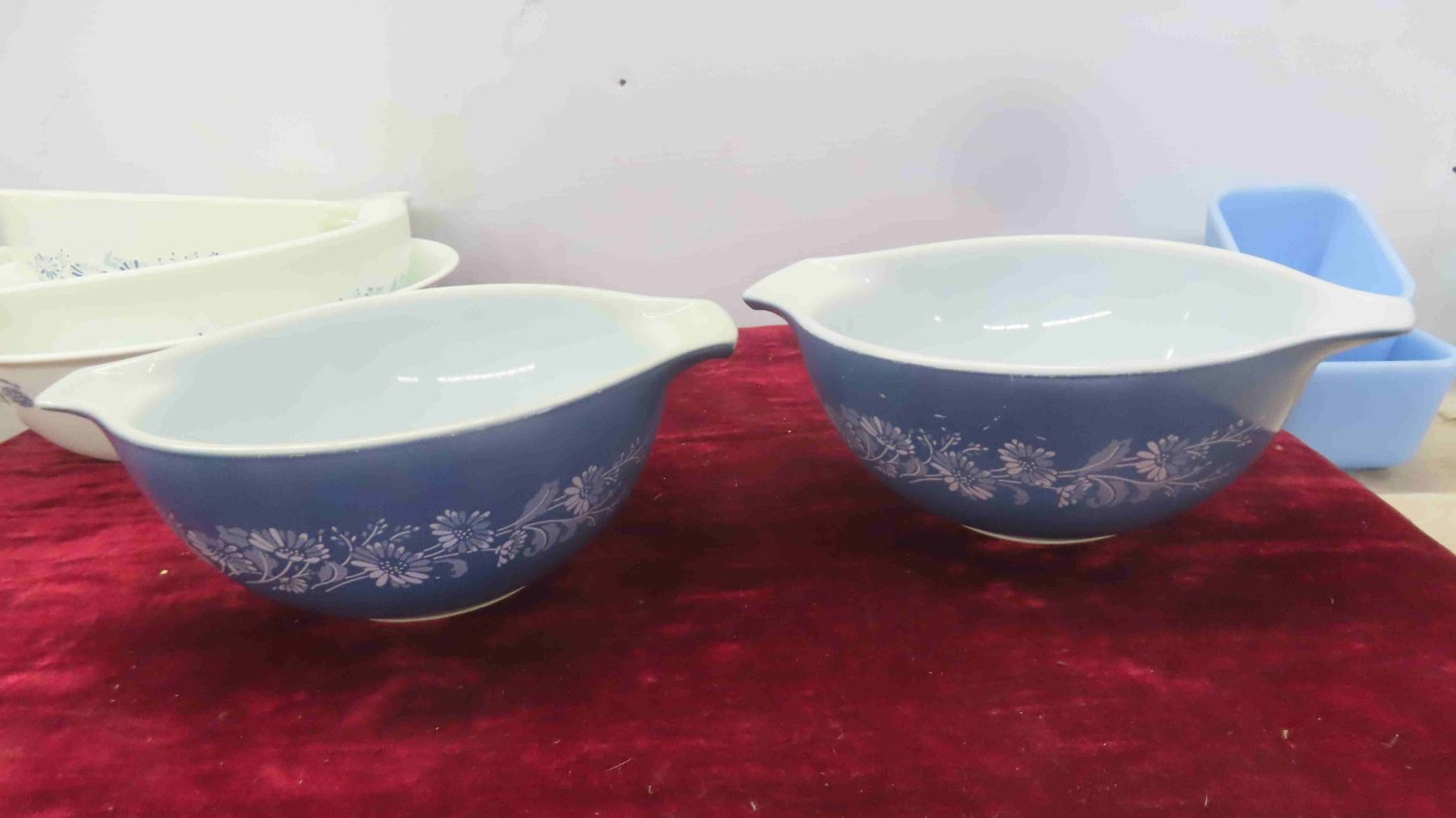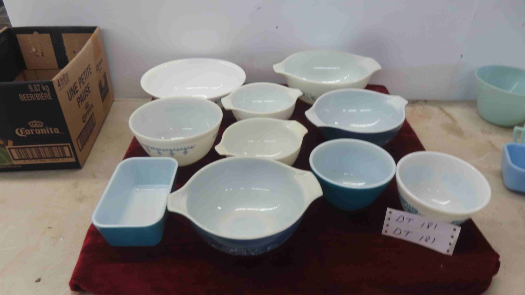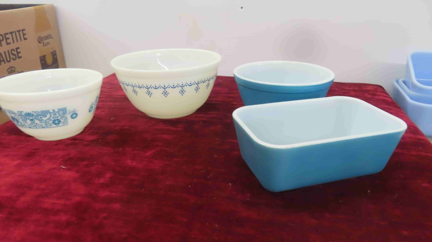 9 Vintage Blue and White Pyrex Mixing Bowls , 1 Covelle Serving Dish