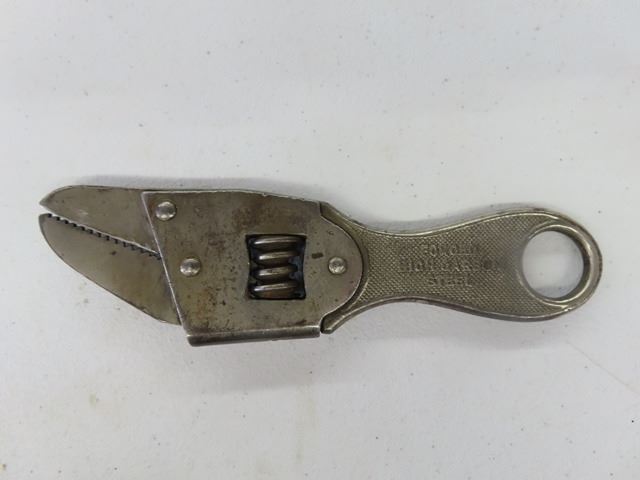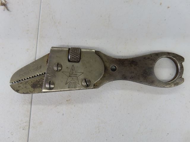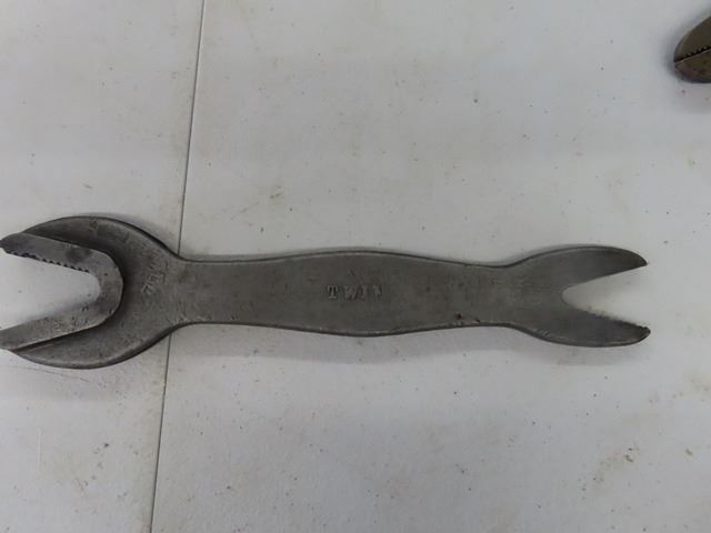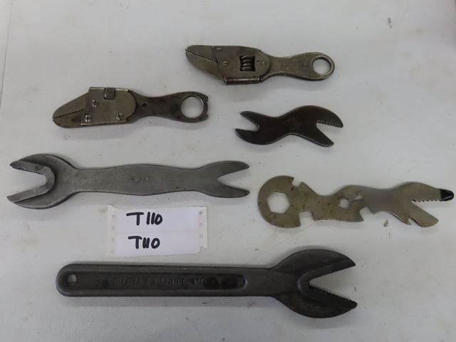 A lot of 6 Antique Vintage Alligator Wrenches of Various Sizes: (1) 12”- 2 ½ Bull-Dog wrench made by Whitman and Barnes Mfg. Co. The next 2 - 10” with the name ‘TWIN’ on the one side. The next is an 8.5” combination wrench that is very whimsical- etched to look like an alligator. Besides being an alligator wrench it is a screwdriver, bottle opener and regular wrench with various bolt sizes cut into the sides. It is manufactured by ROBINSON, alligator Patent + Victor wrench manufactured by Kraeuter & Co. of Newark N.J. with a patent of May 26, 1903. The 4th alligator wrench is an ELGIN which has a patent date of June 8 1897. Finally, there is a small 5” double ended Whitney and Bowes made in Canada.