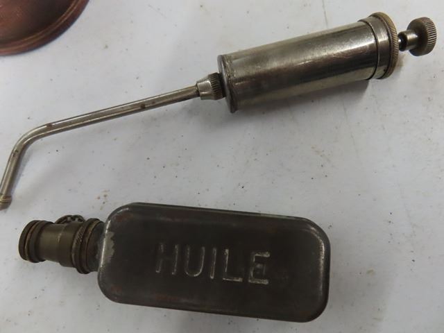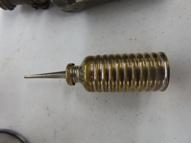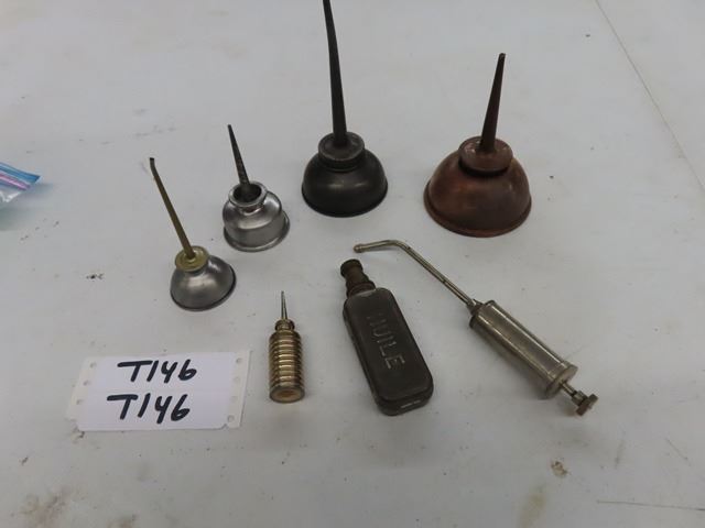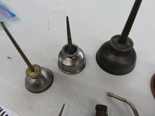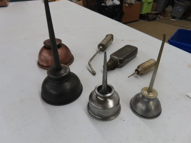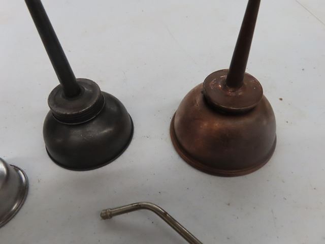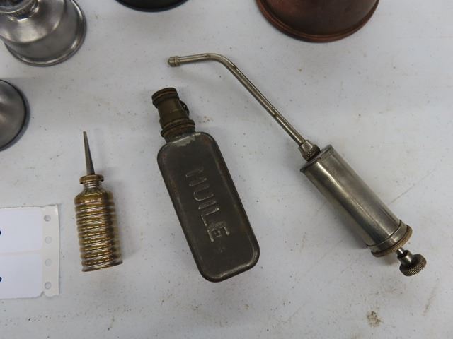 A lot of 7 Vintage Antique Oil Can Thumb Pump Oilers. The squarish one is French military. The other 6 are unmarked