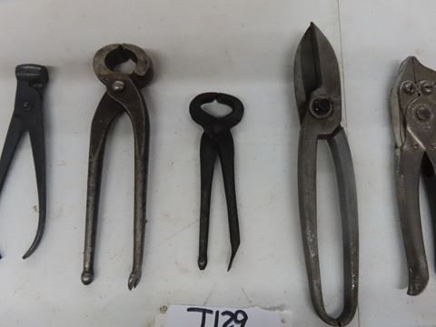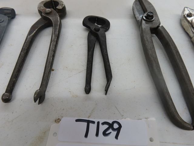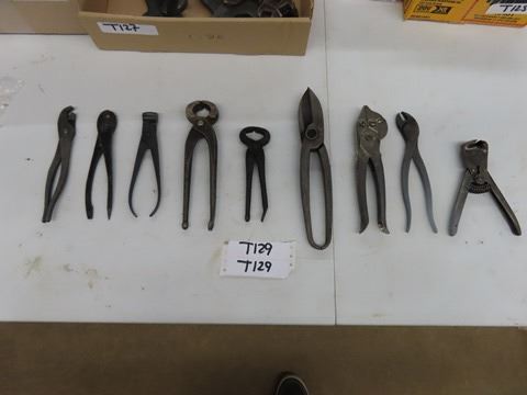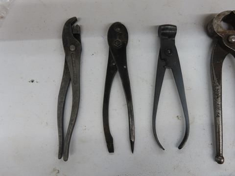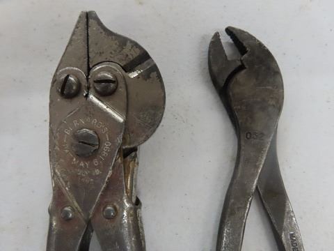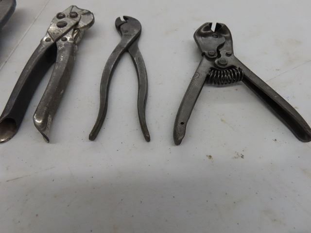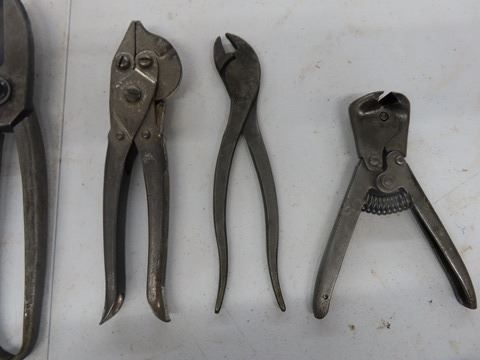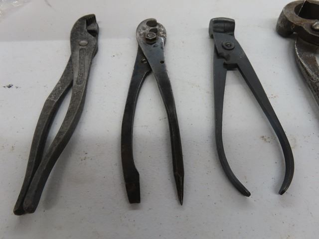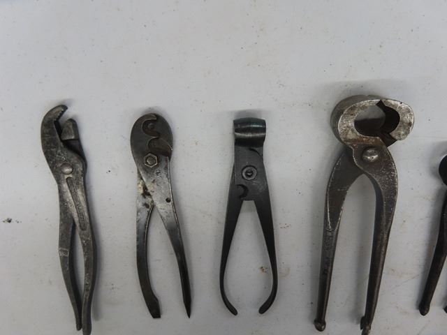 A very large lot of Antique Vintage tools.; 2 nippers pincers, one made by Elliot Lucas and the other by P. S. & W. England, a set of Bernard pliers made by W. Sholthorn, Patent July 19-1892, Blue Bird wrench No. 52. There is also a bullet maker, multitool by WM Schollhorn, Senator pliers made in 1947 + unmarked pair of snips.