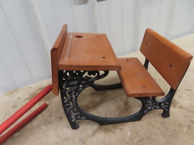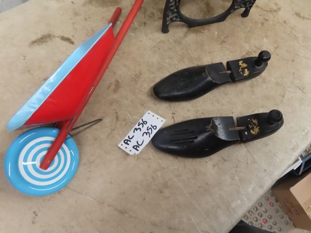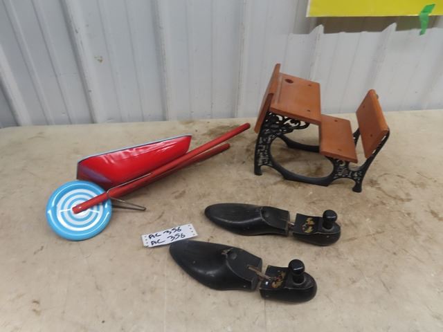 (AC) Cast & Wooden Ornate School Desk, Child's Metal Toy Wheel Barrow, & Shoe Stretchers