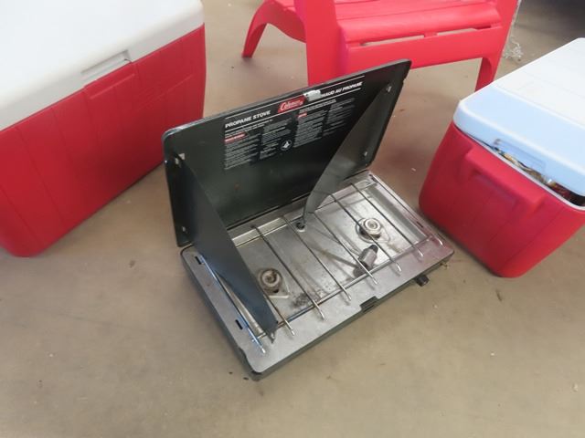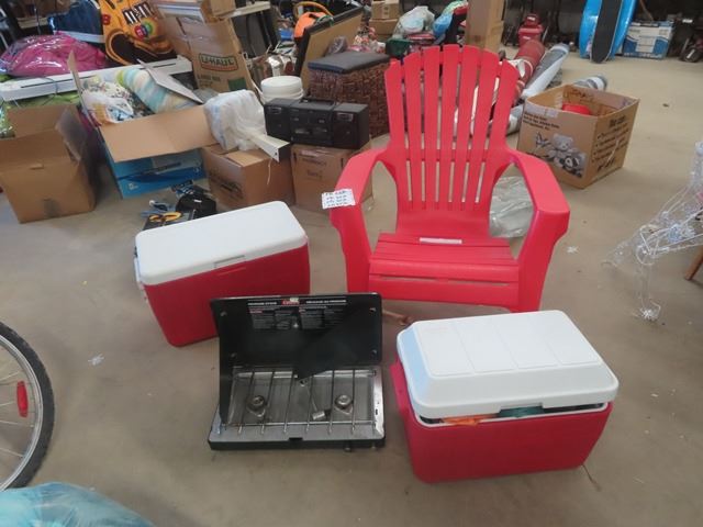Adirondak Yard Chair , 2 Coleman Coolers, Coleman Stove, Camping Dishes