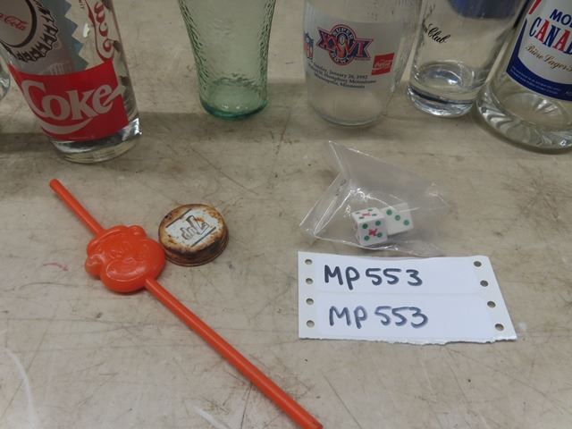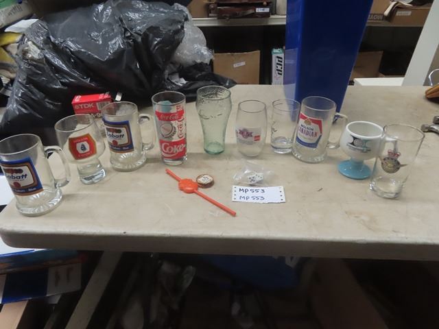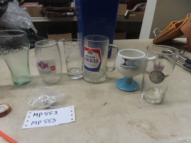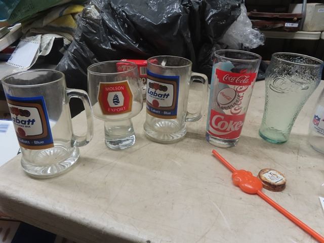 Advertising Glasses; Coke, Beer, RCAF, A&W Straw, 7Up Dice