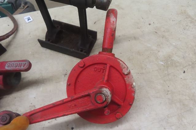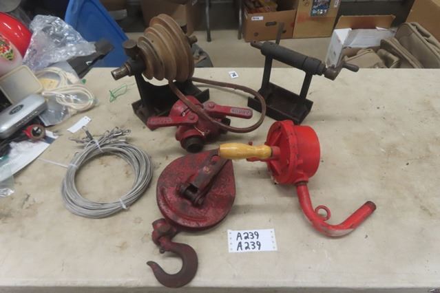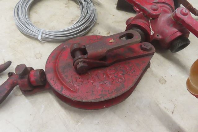 Angus 2 Hose Splitter, Crosby Hook Pulley, 2 Cast Iron Pulley Items, Barrel Pump