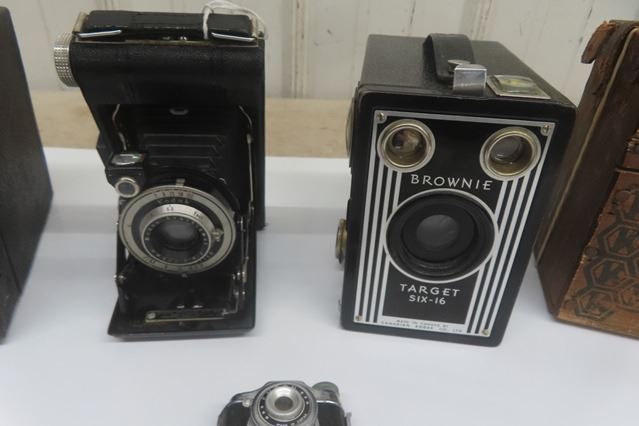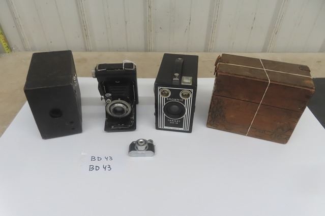 Antique Camera Lot Including: 2 Kodak Box Cameras, 1938 Kodak Folding Camera - Early 1900's Rare Kodak Wooden Camera Box, Mini Working 1950