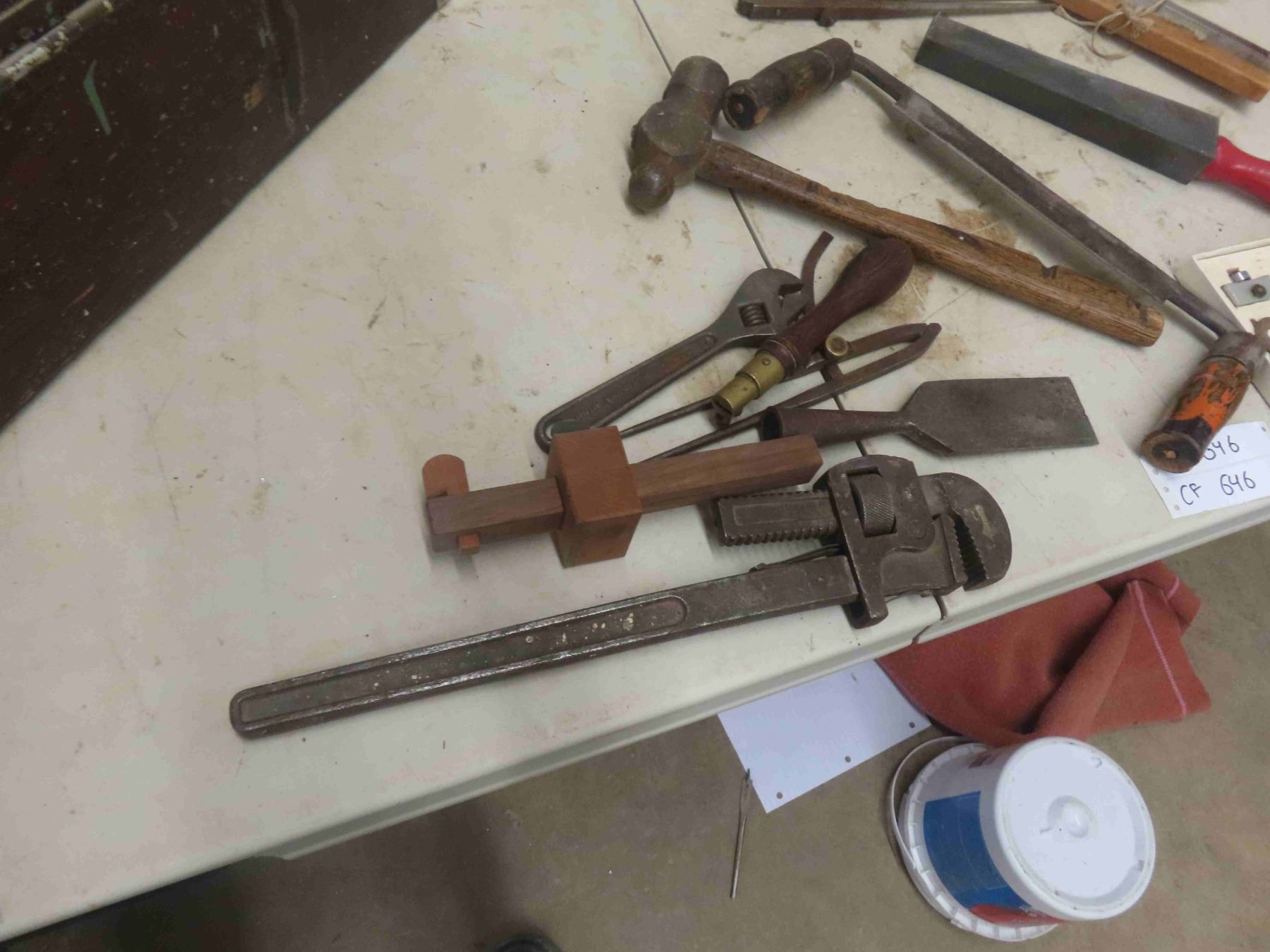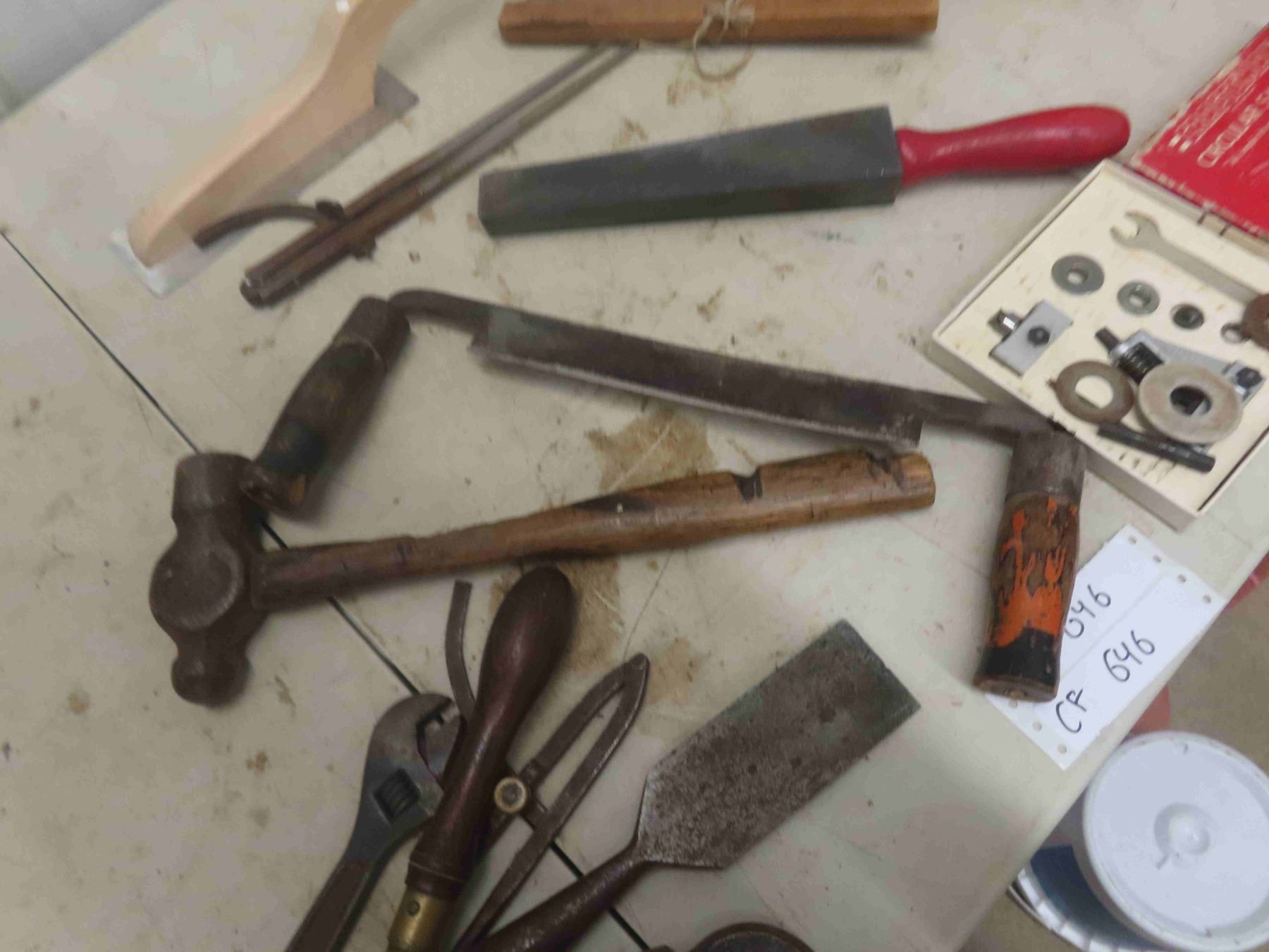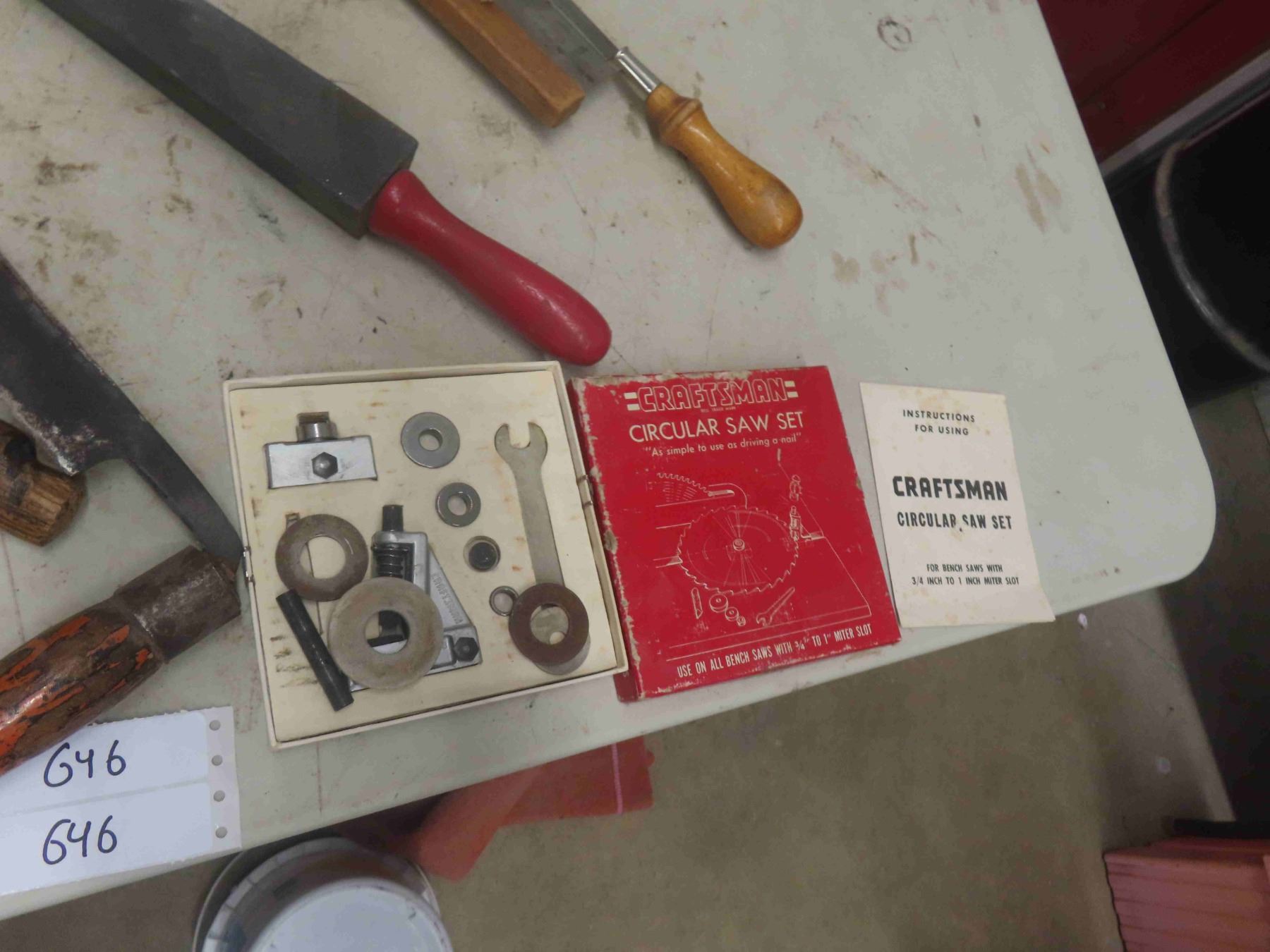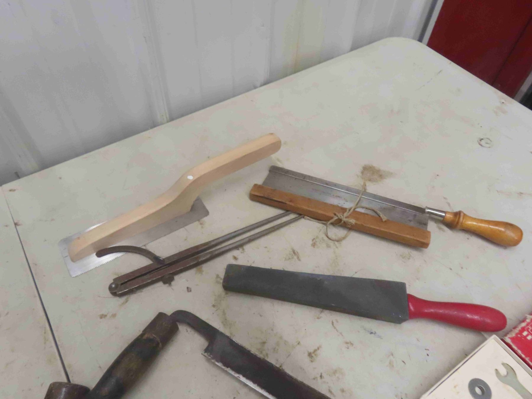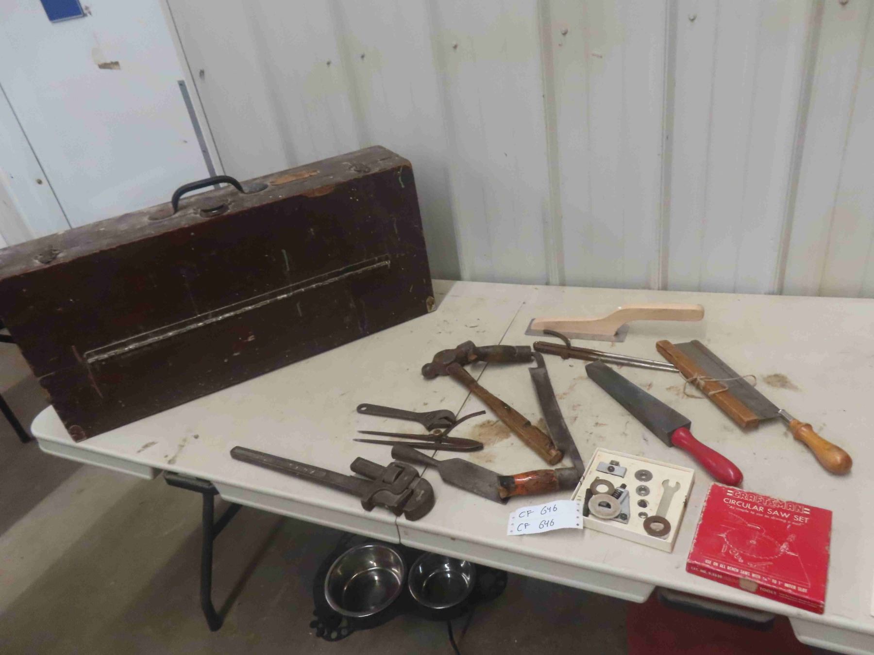 Antique Carpentry Tool Box with Some Tools; Saws, Draw Knife, Circular Saw