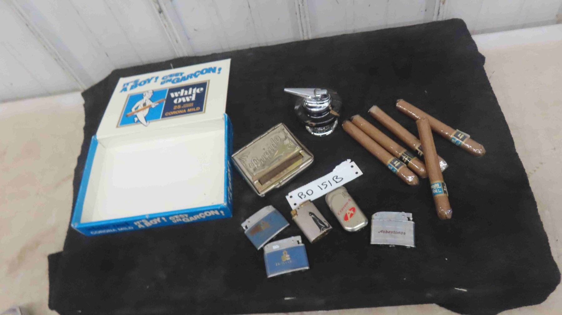 Antique Cigarette Maker and Advertising Lighter Lot , Few Cigars in Original Box, Retro Ronson Table Lighter