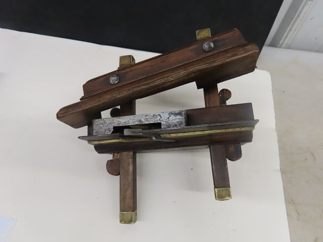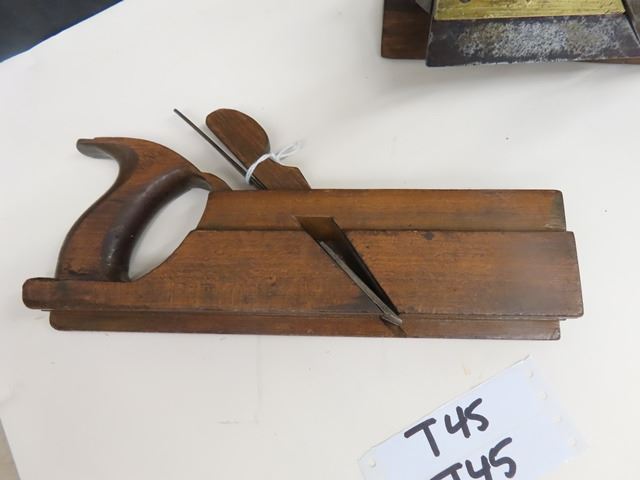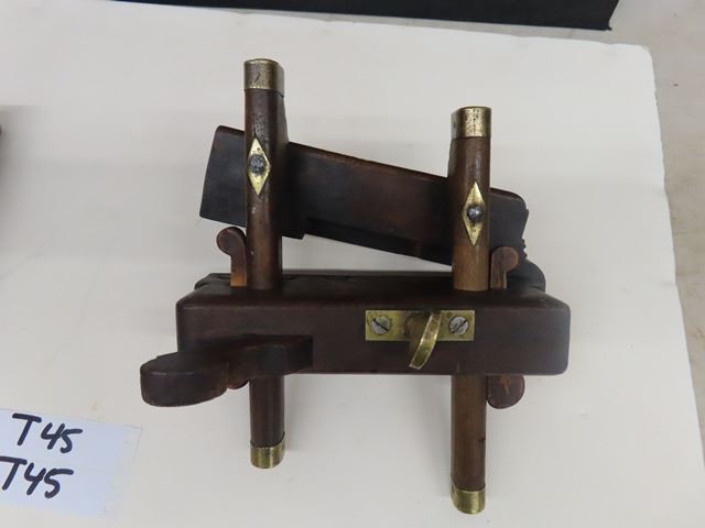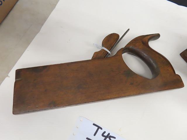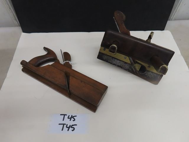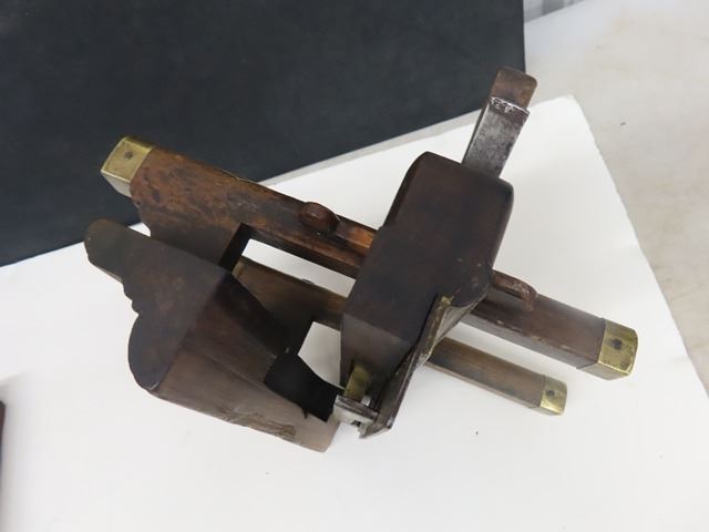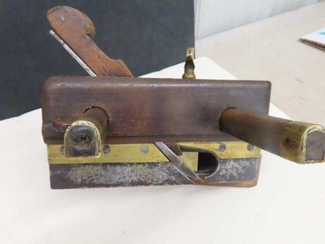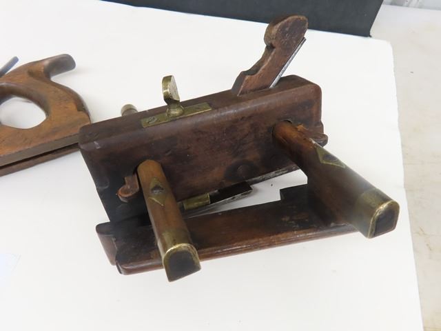 Antique European screw arm plow plane with brass tips, marked W. DIBB, YORK OH. The second plane is a handled tongue and grove plane by Auber Tool Co No. 73