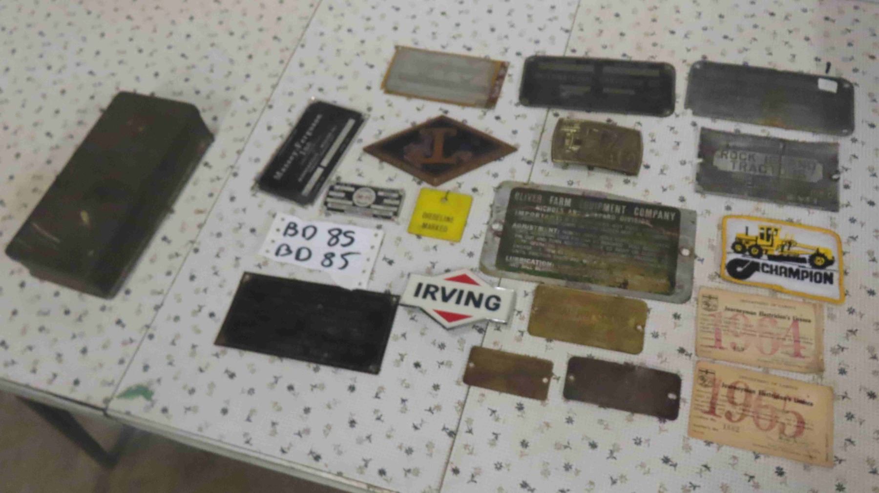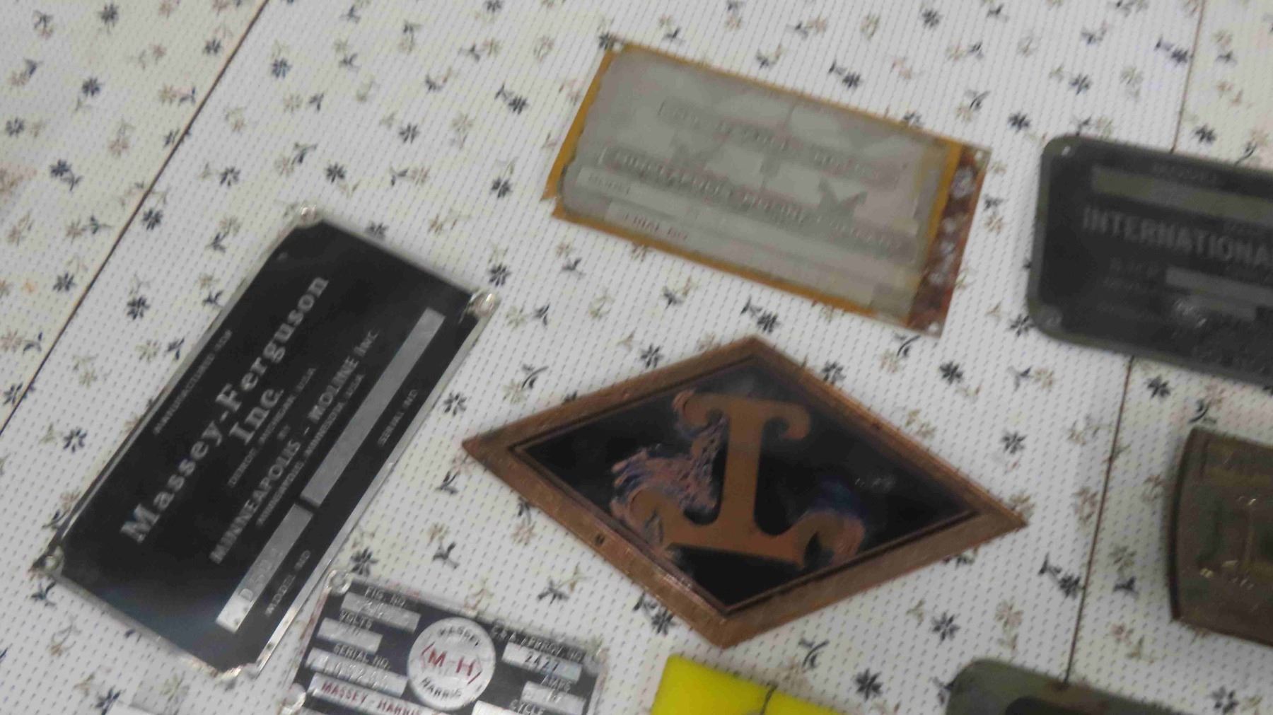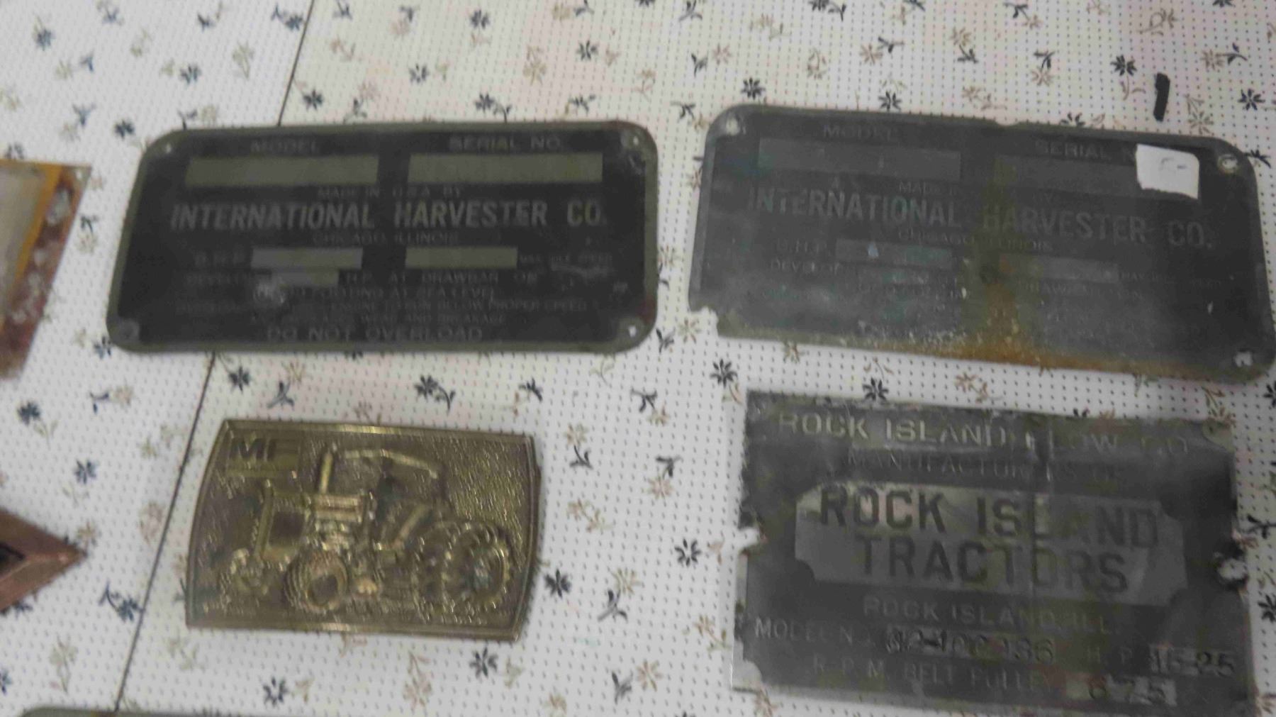 Antique Farm Equipment Model Number Tags , Lots are Brass: Oliver, International Harvester, Minniapolis Moline, Graham Plow, Cockshutt, Rock Island Tractors, Model D Tractor, Massey Harris & Brass Belt Buckle
