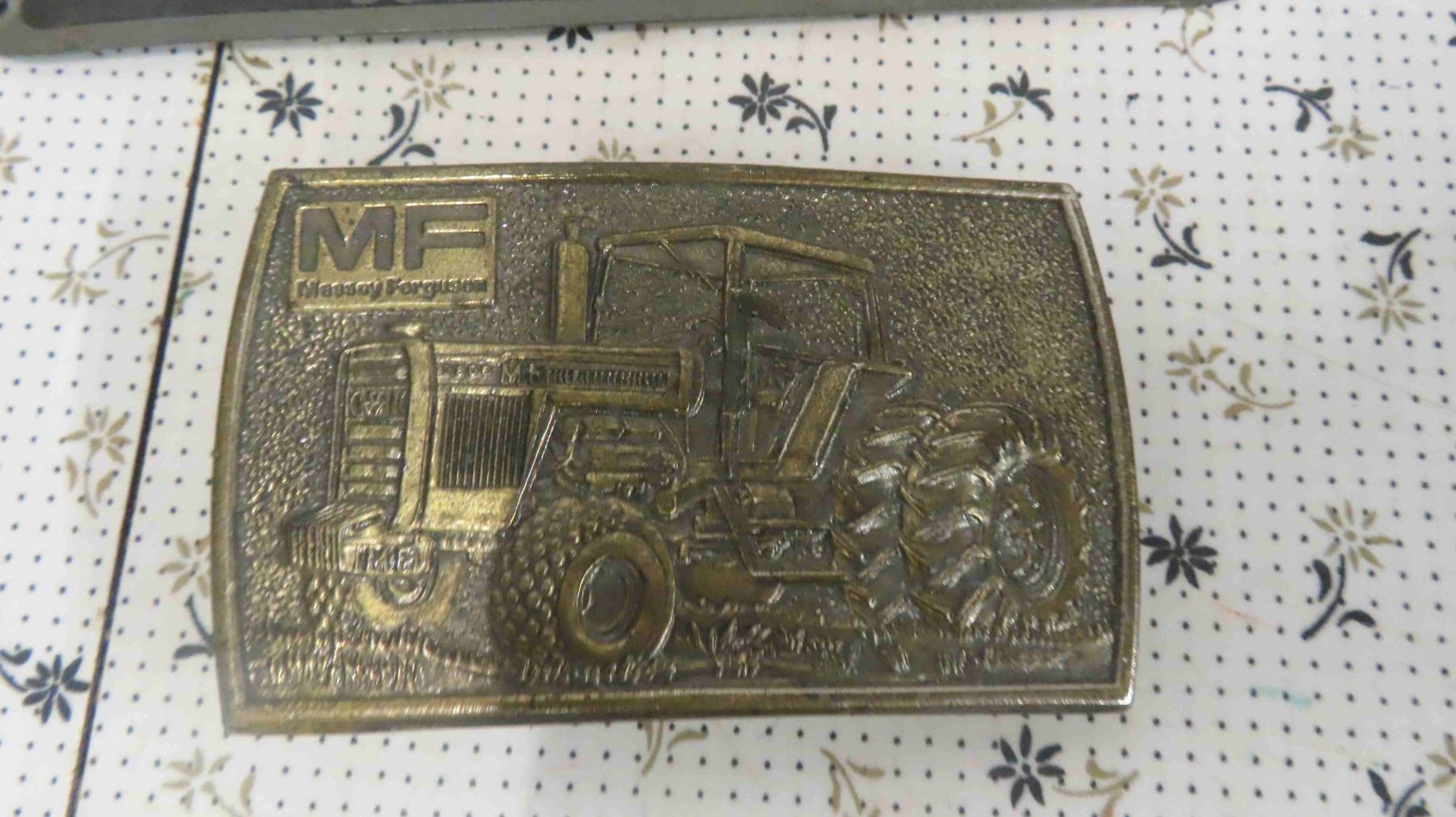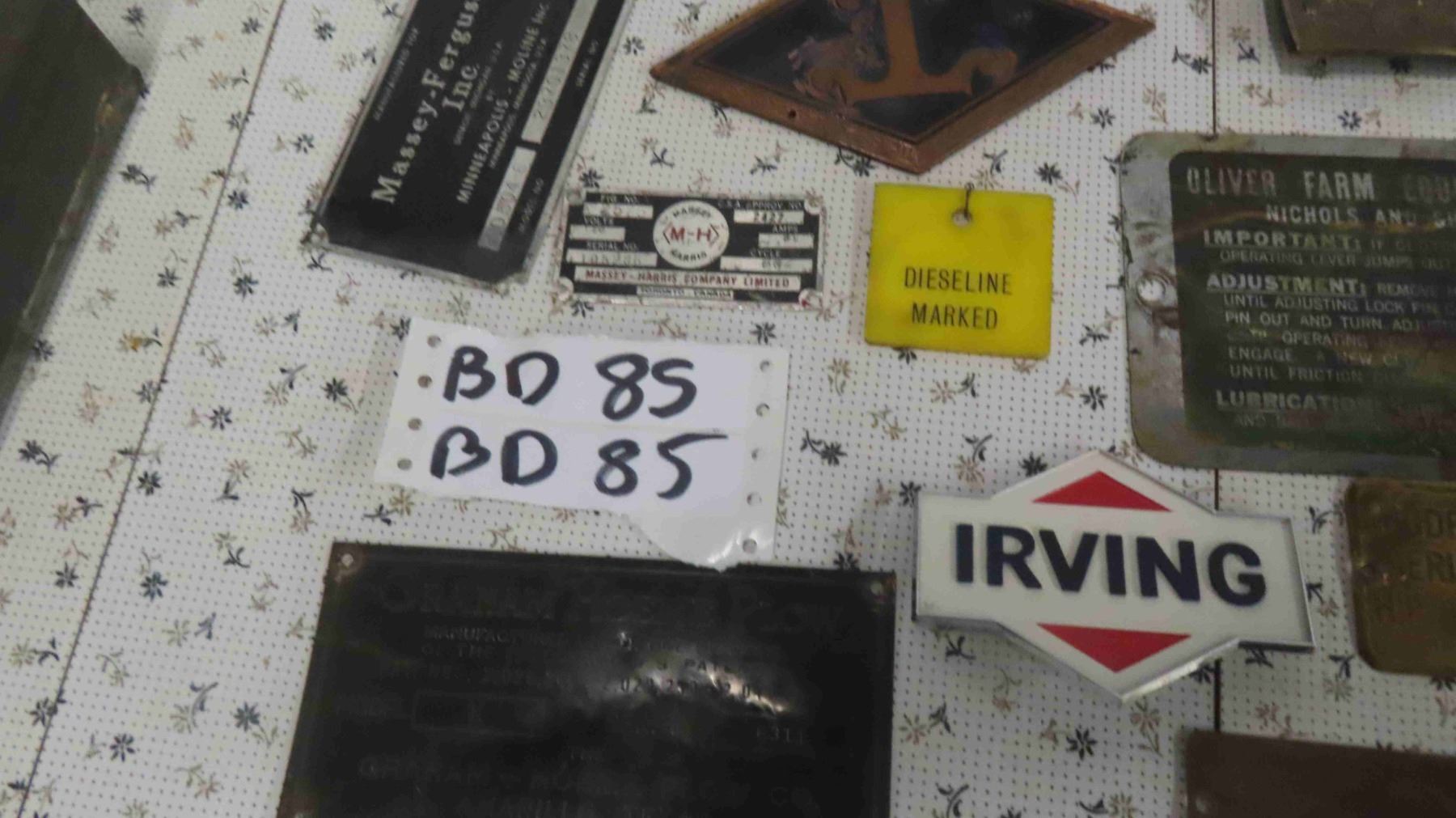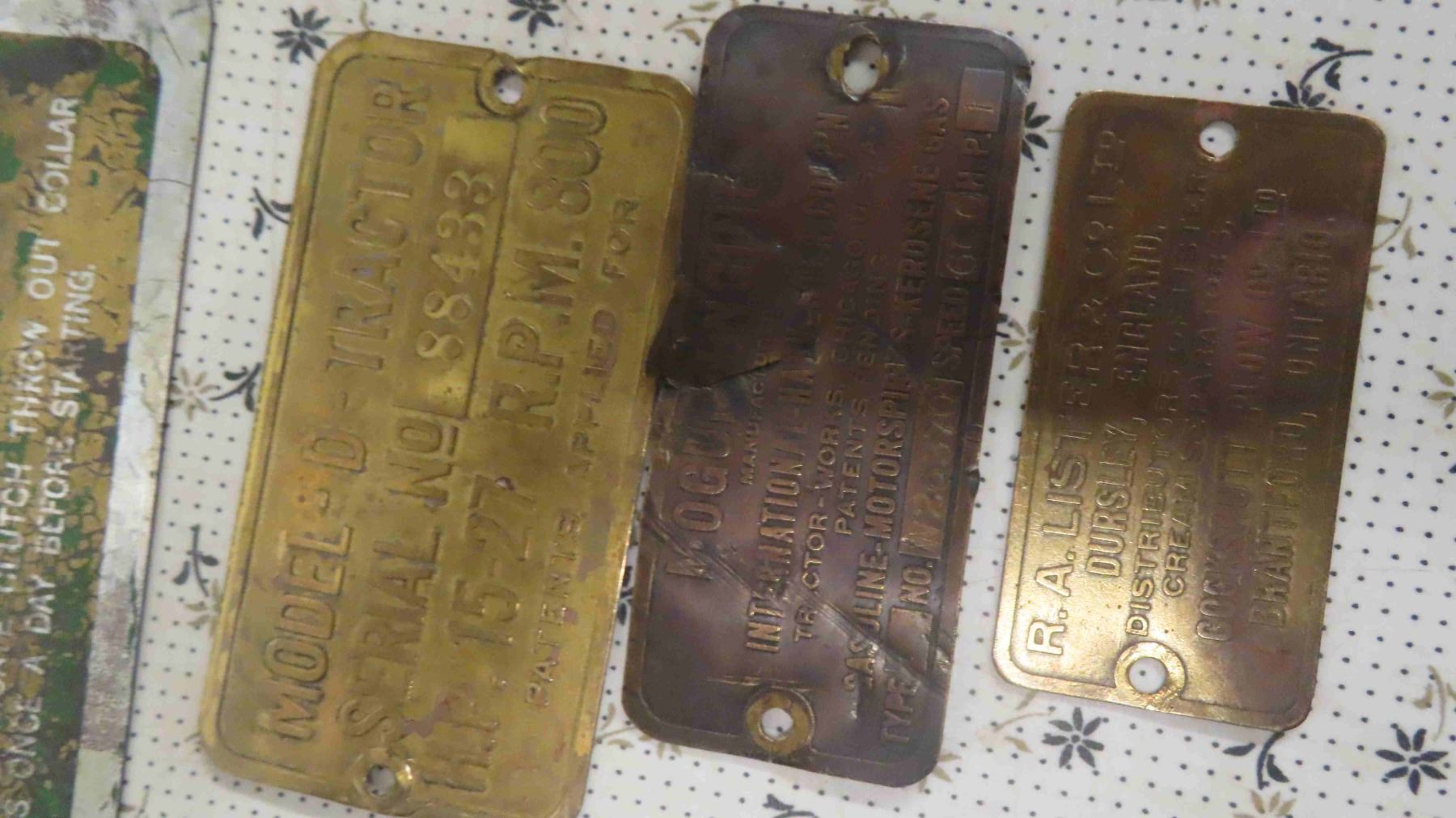 Antique Farm Equipment Model Number Tags , Lots are Brass: Oliver, International Harvester, Minniapolis Moline, Graham Plow, Cockshutt, Rock Island Tractors, Model D Tractor, Massey Harris & Brass Belt Buckle