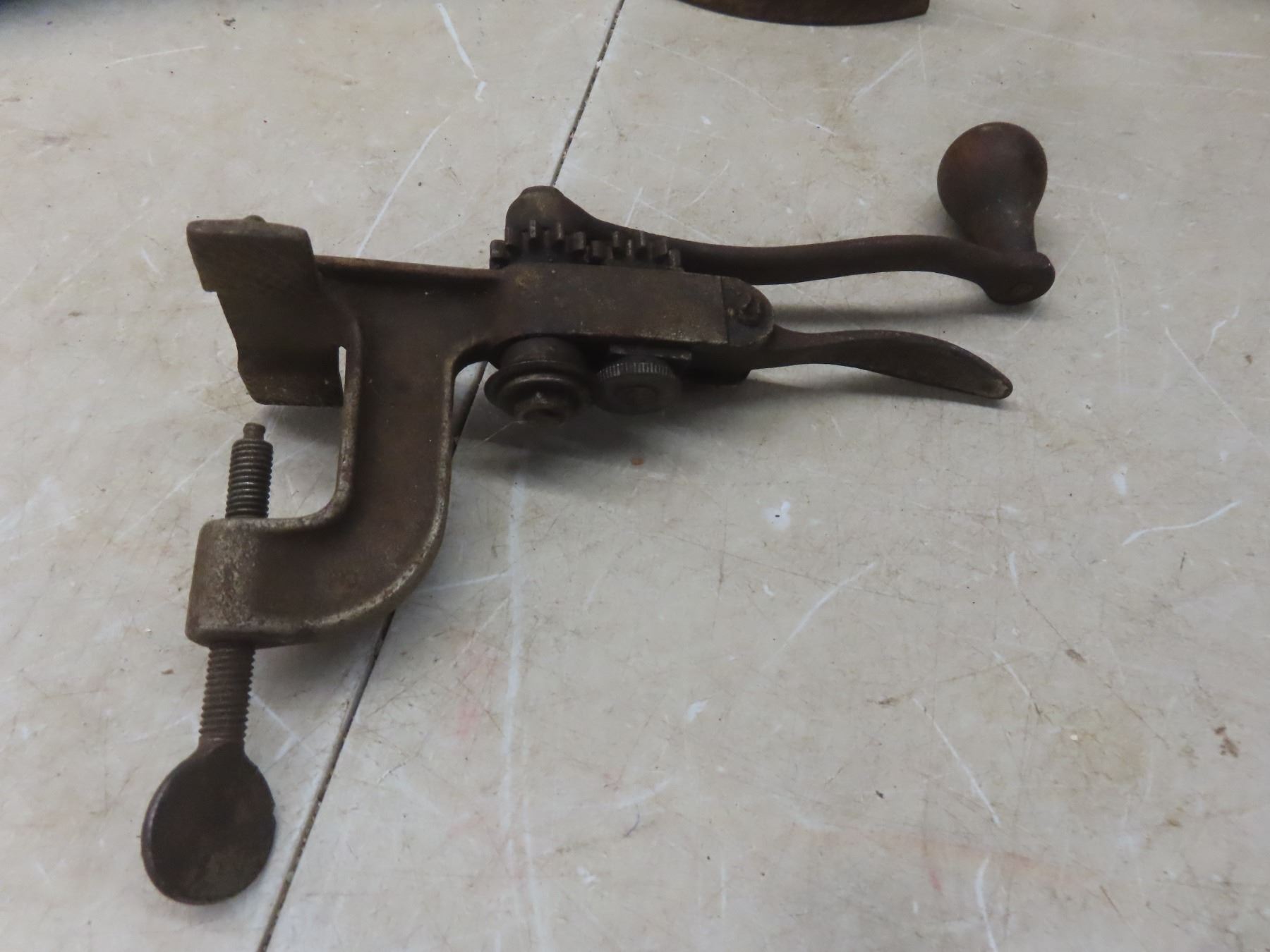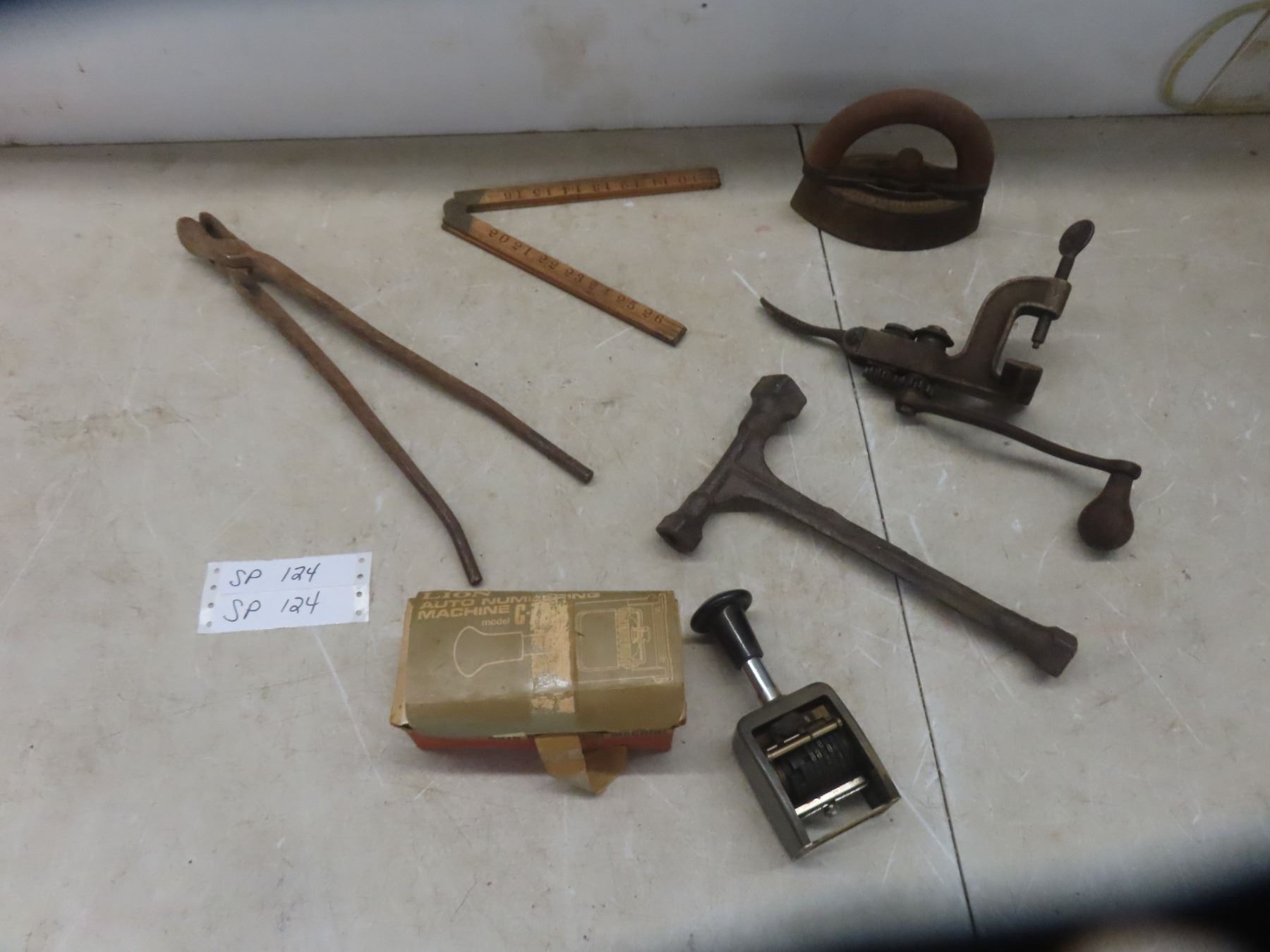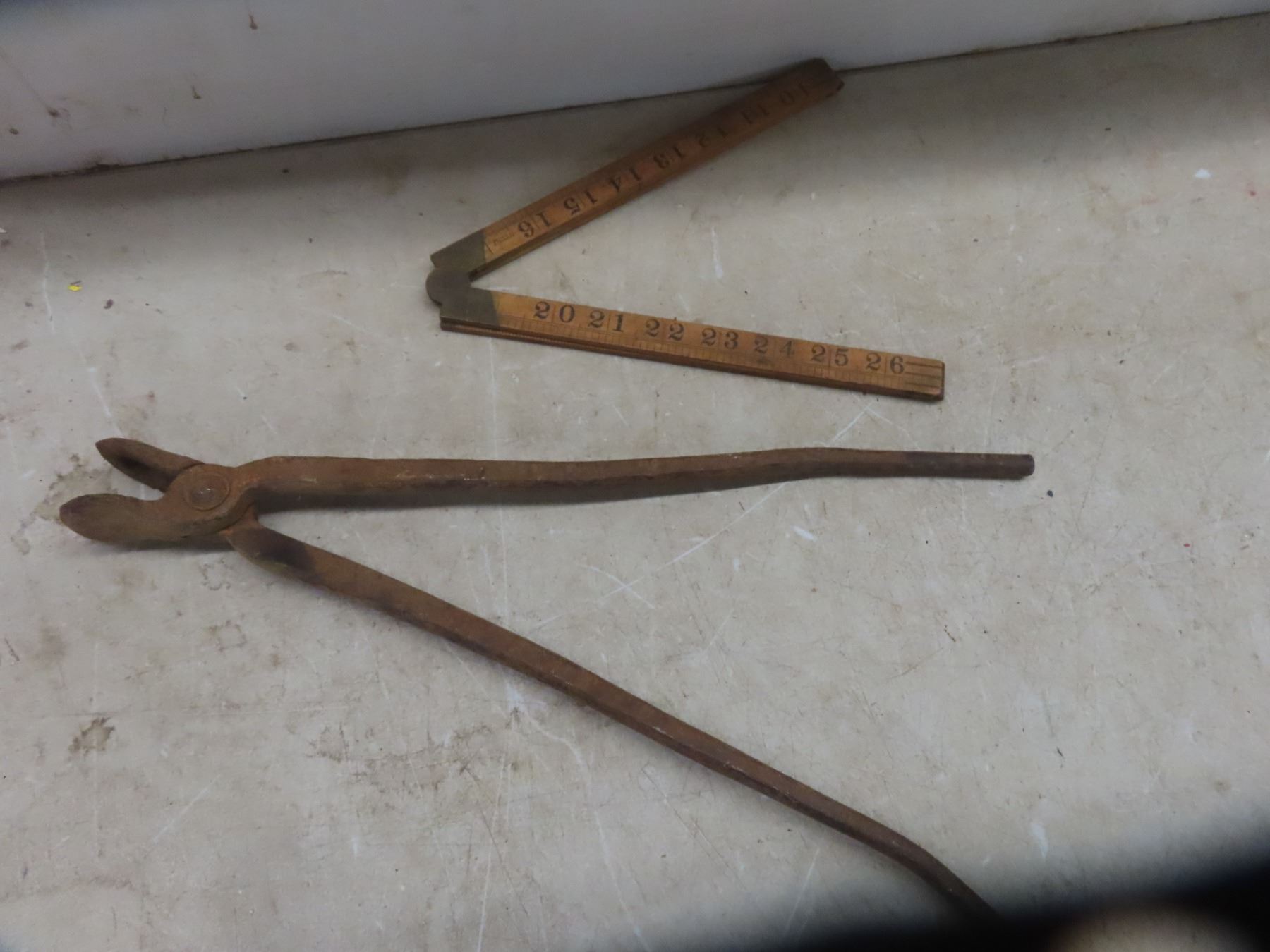 Antique French Shot Gun Cartridge Shell Press Reloader, T Handle Wrench, Wood Folding Ruler, Blacksmith Tongs +