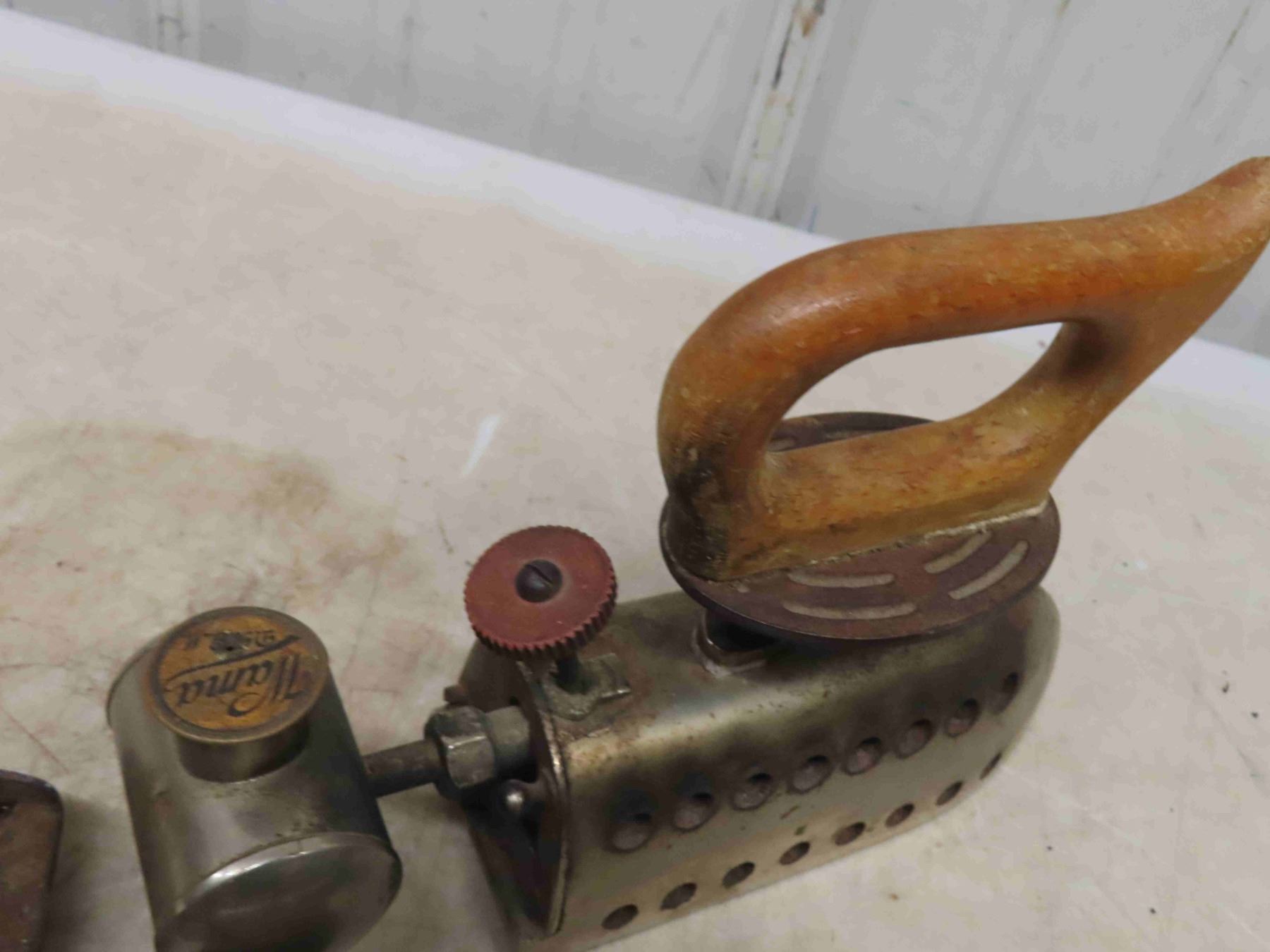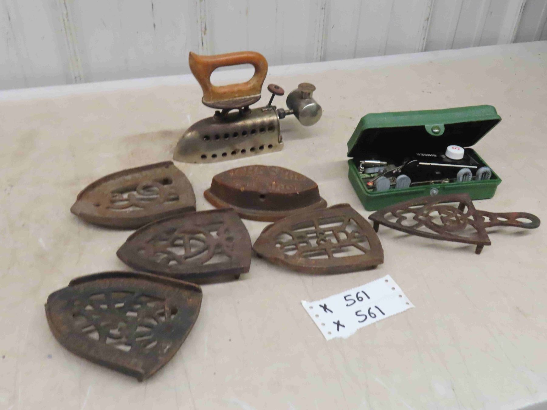 Antique Gas Iron - Wama, 5 Iron Rests, Singer Button Sewing Device