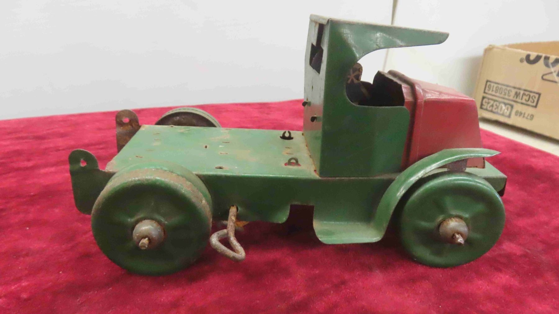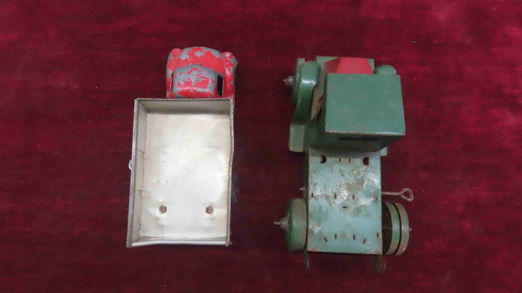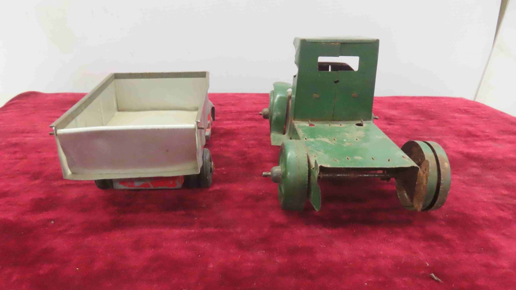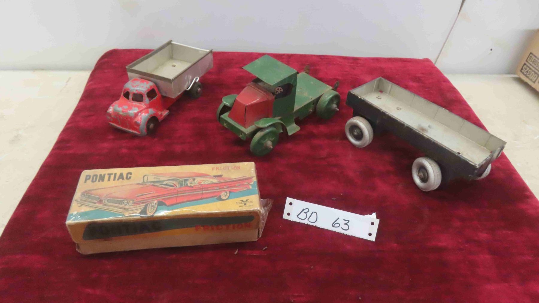 Antique Toy Lot : Steel and Tin Wind Up Dump Truck , Tin Freight Wagon , Tin Truck Cab , Empty Japan Toy Box for Pontiac Toy Car