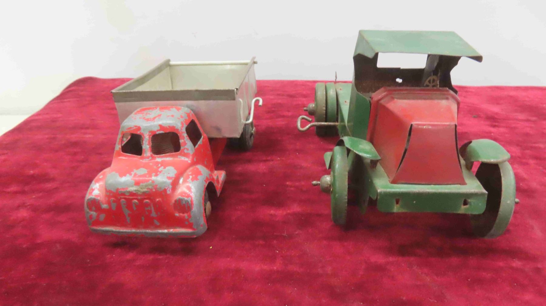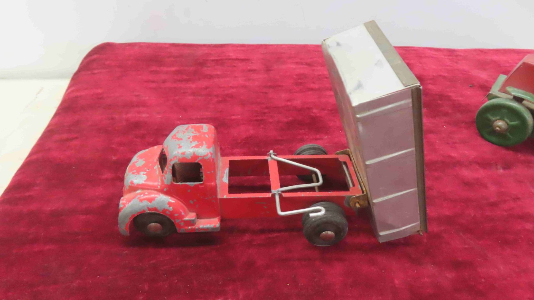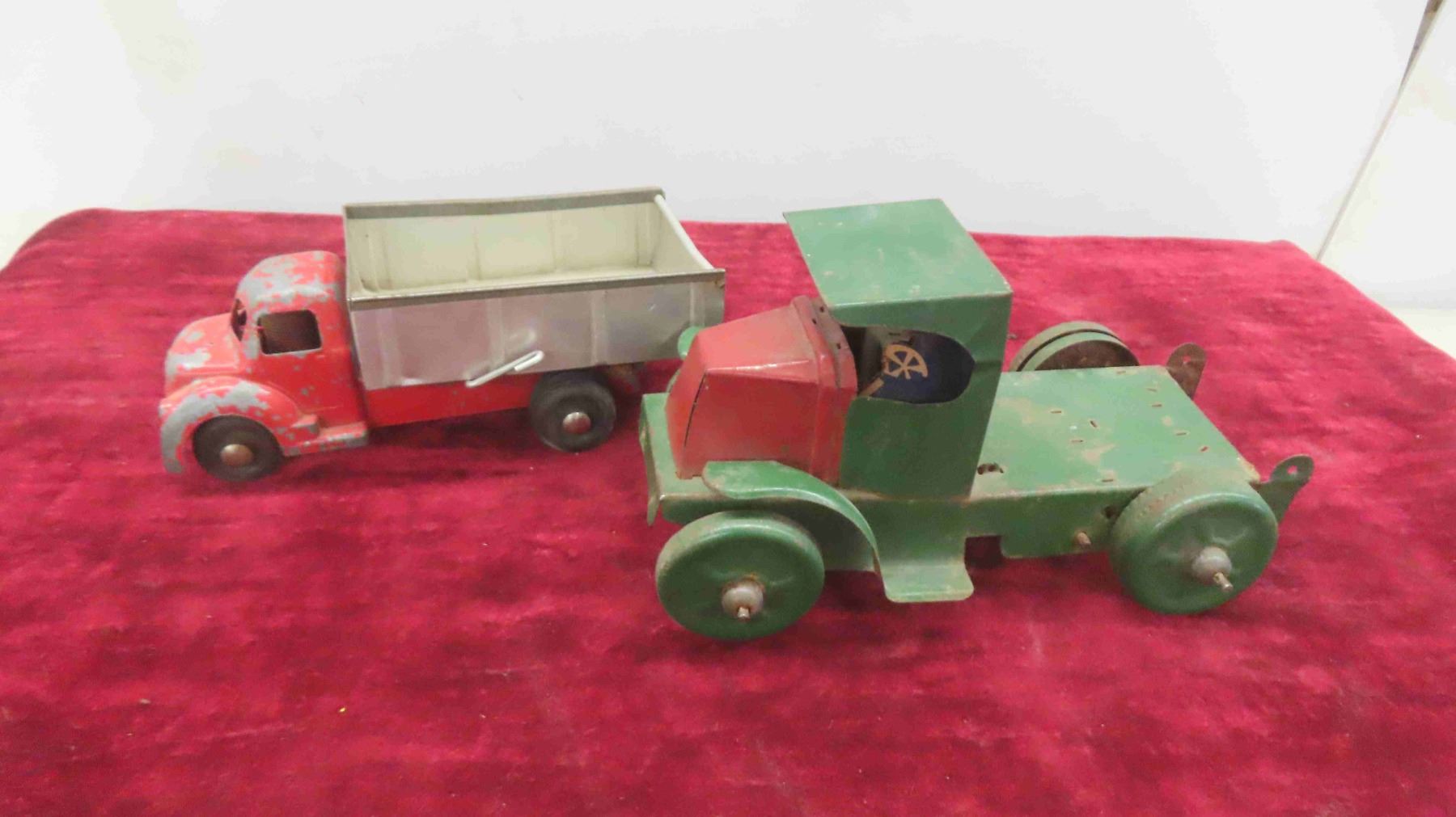 Antique Toy Lot : Steel and Tin Wind Up Dump Truck , Tin Freight Wagon , Tin Truck