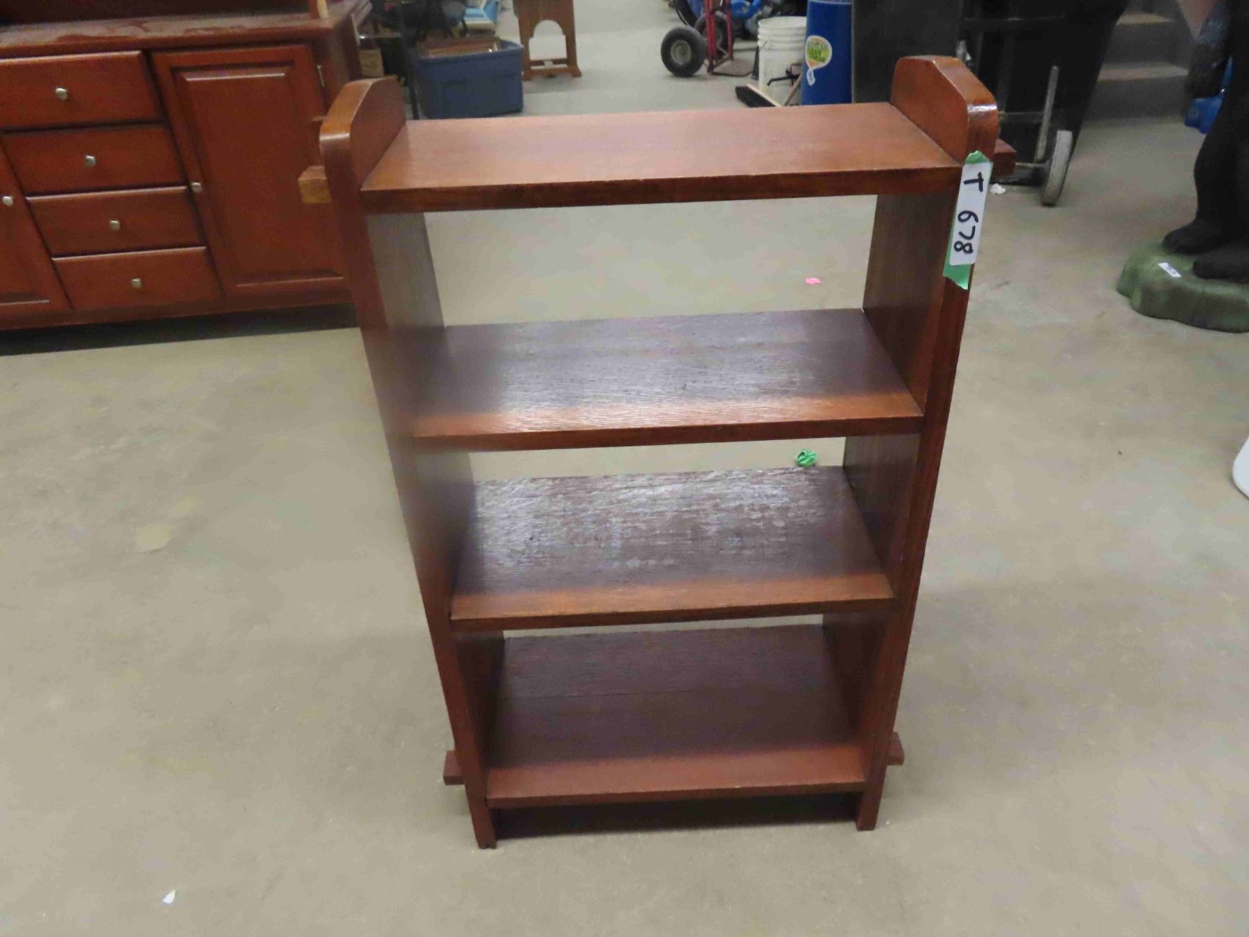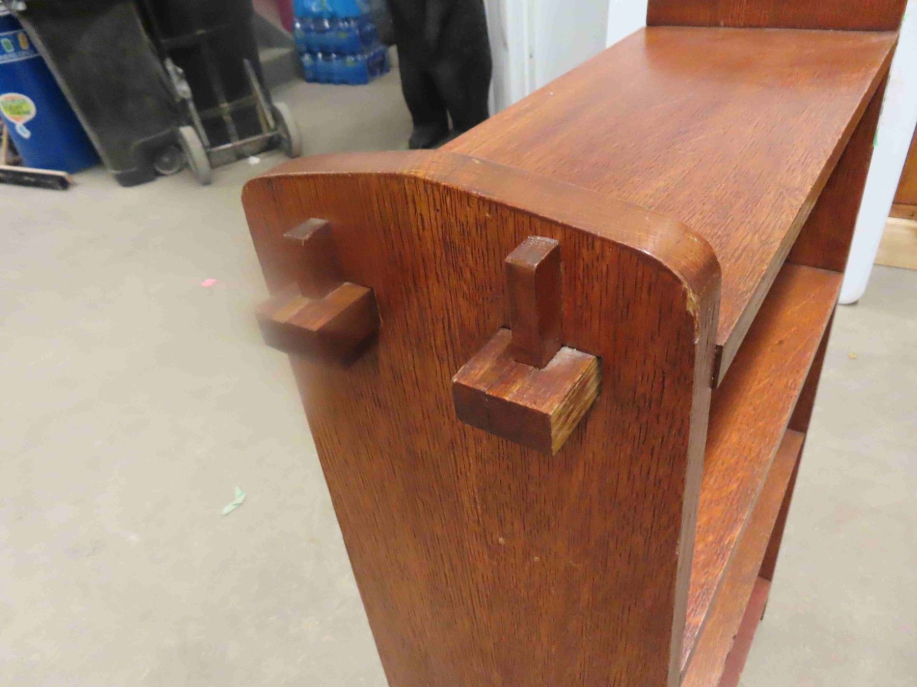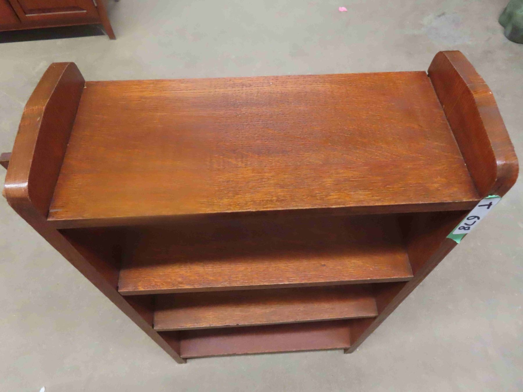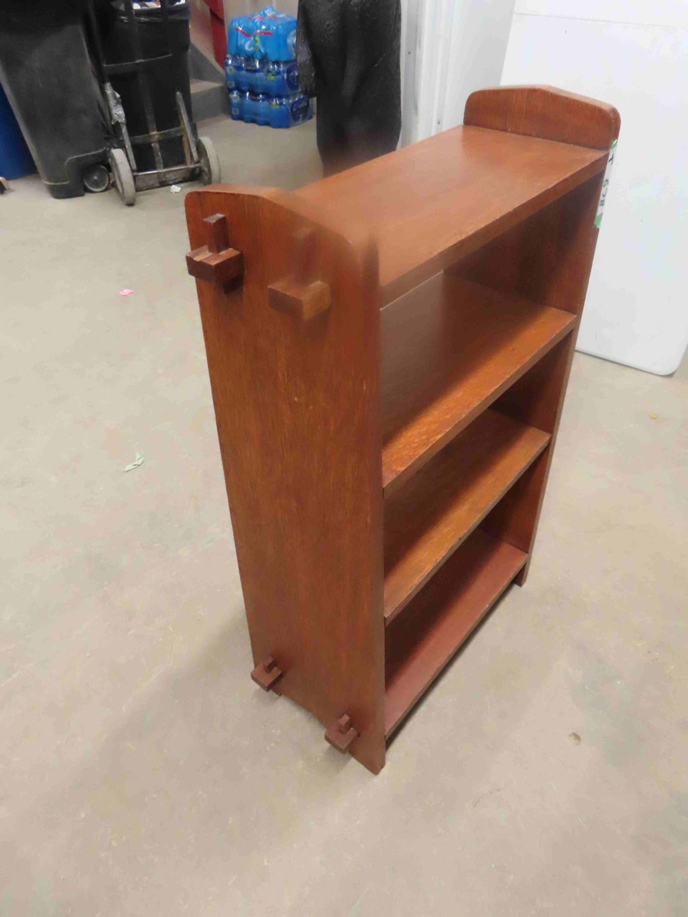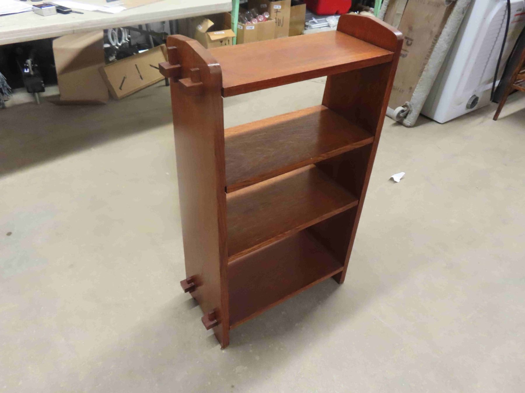 Antique Vintage 3 Tier Upright Bookshelf in a Mission Oak Style - refinished and looks great. The wooden pegs on the sides are real and not fake. about 38” x24”
